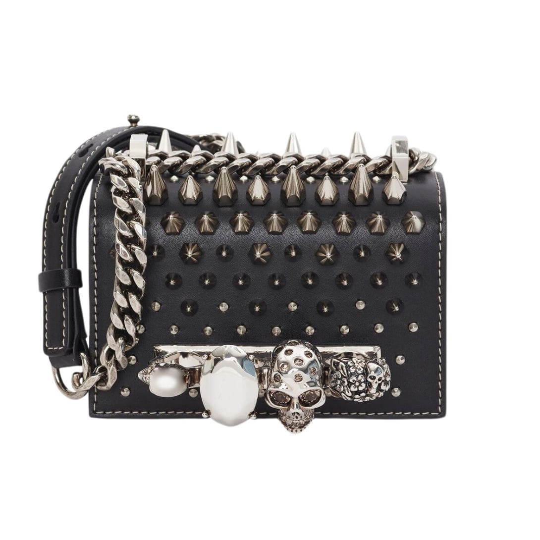 The design includes a biker-inspired leather strap, adding an edgy touch to its chic appearance. Despite its compact size, this bag comfortably accommodates smartphones, making it both practical and fashionable.