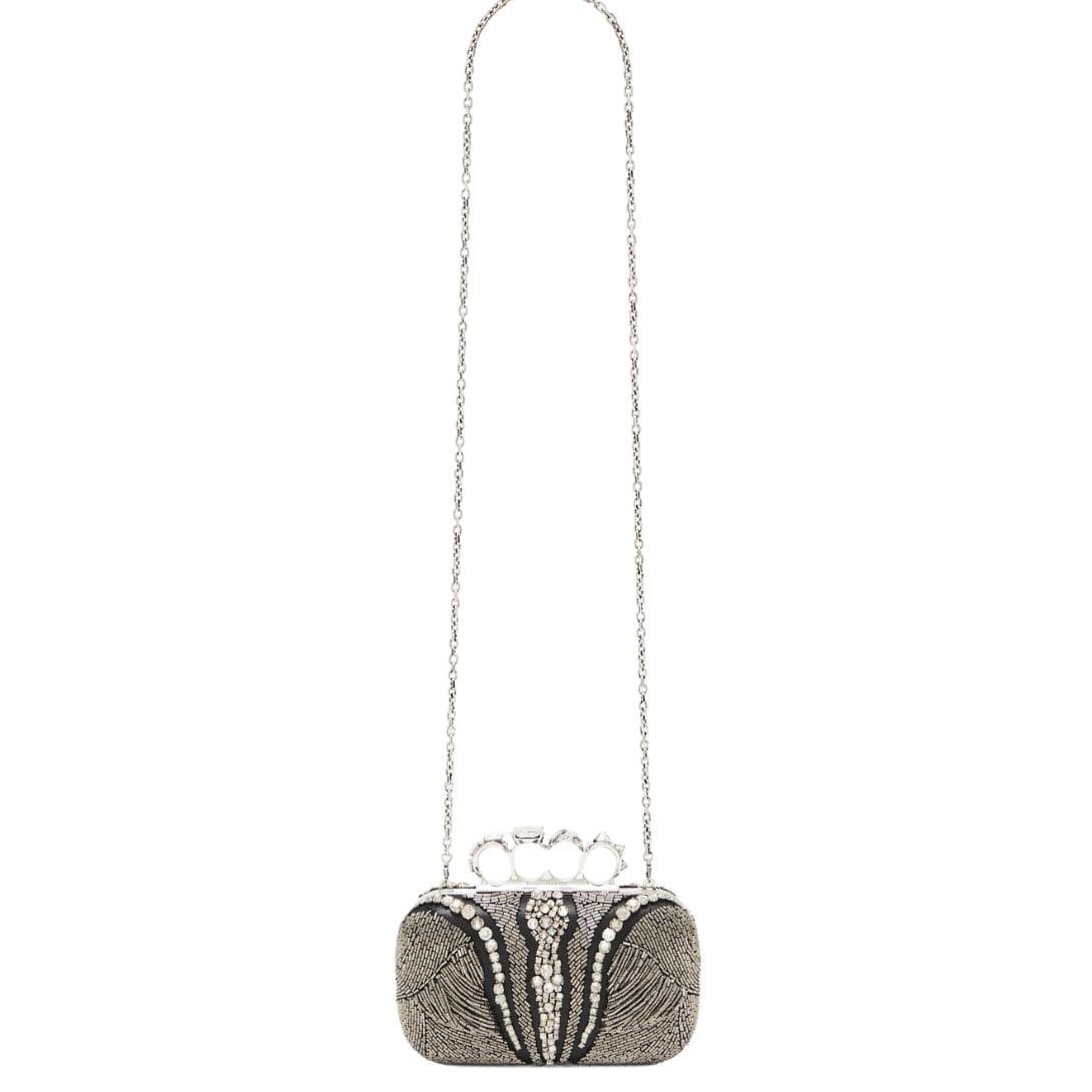 Introducing our stunning Knuckle Clutch, featuring an all-over silver-tone embroidery with clear crystals and a handle adorned with crystal-encrusted rings. This versatile clutch can be worn either hand-held or over the shoulder using its chain strap.