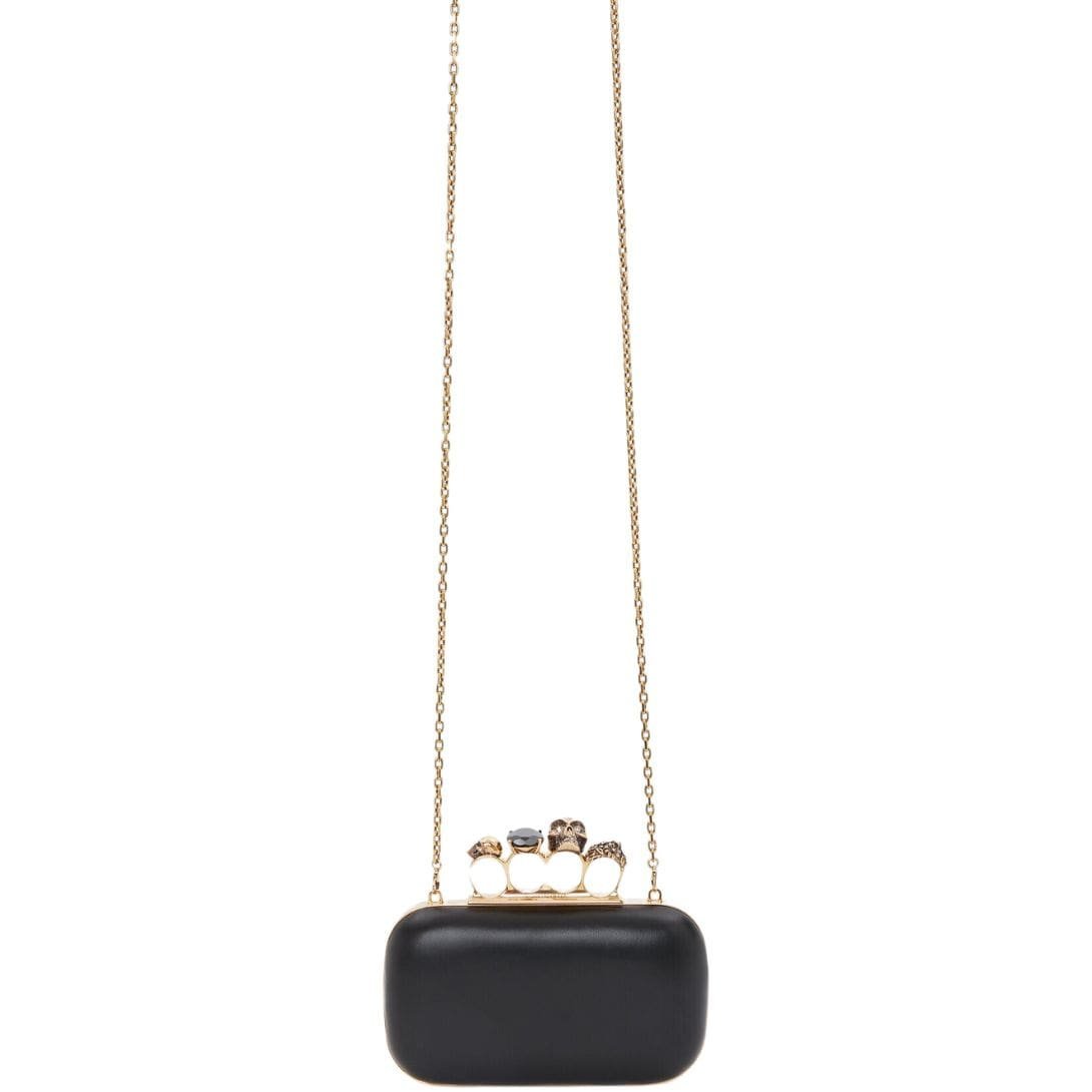Introducing our Black Nappa Leather Alexander McQueen Women’s Knuckle Clutch with chain in black, featuring an antique gold-finished handle adorned with crystal-encrusted rings. This luxurious clutch offers versatility, allowing you to wear it either hand-held or over the shoulder with its removable antique gold-finished chain.