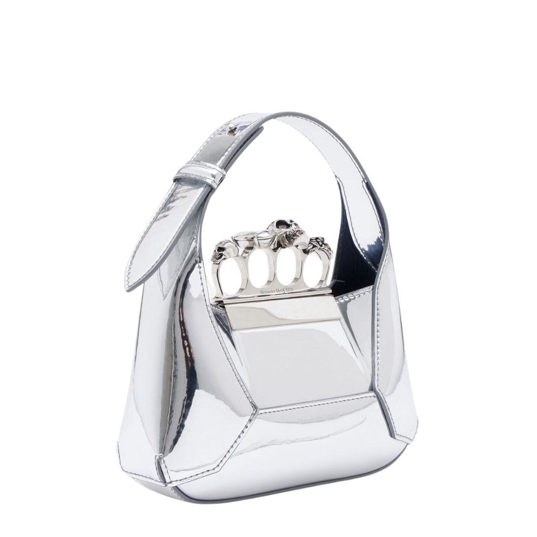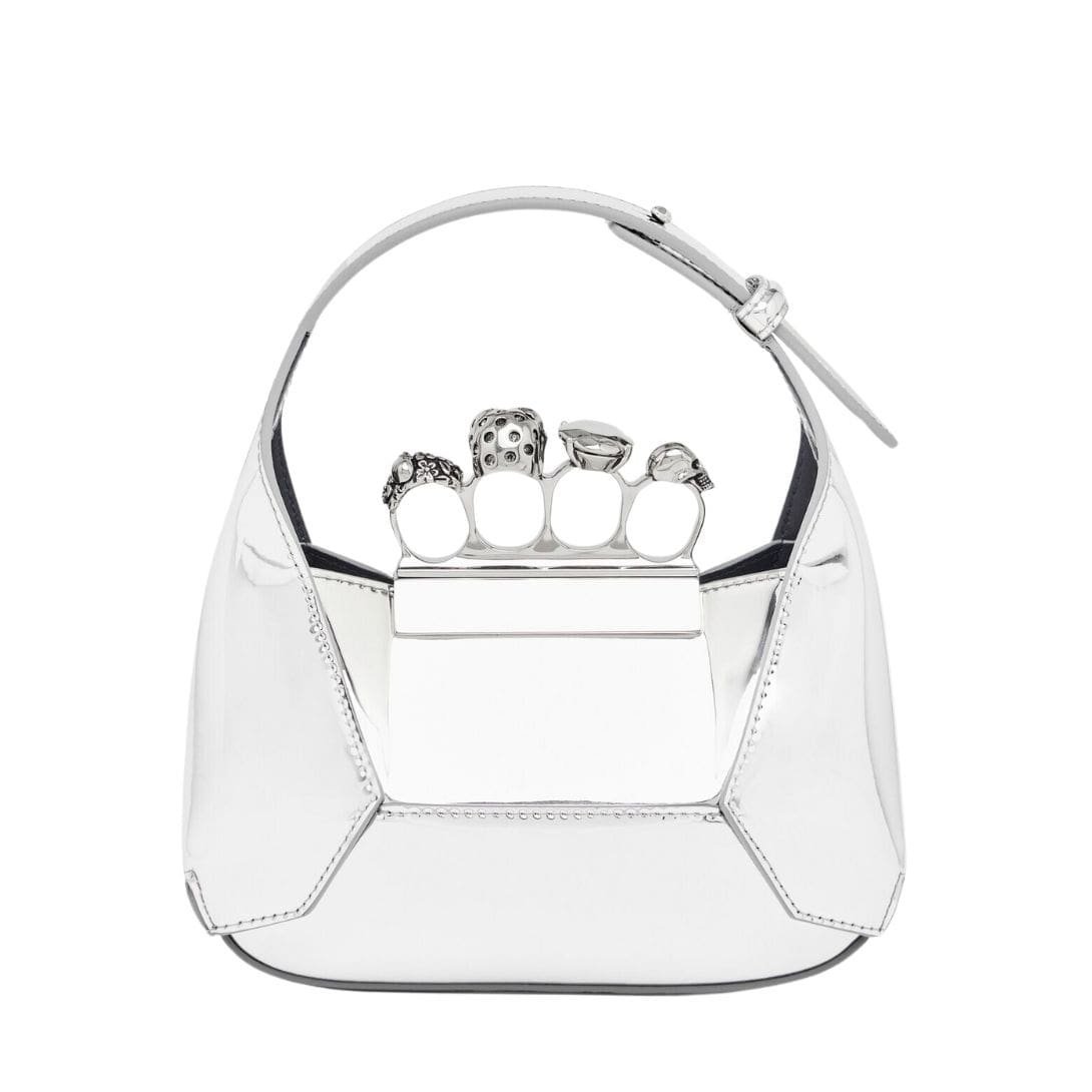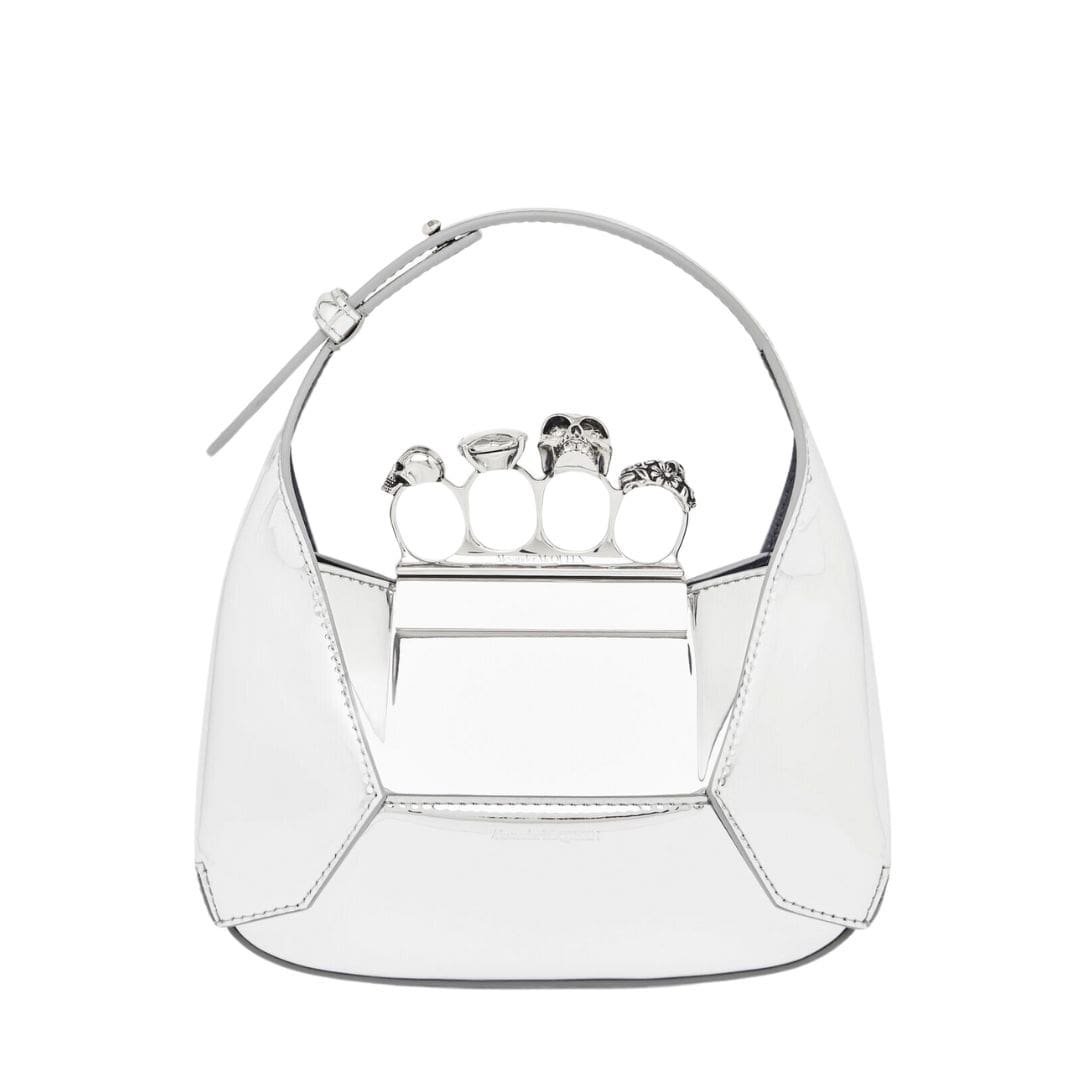 Silver-tone metallic fabric Alexander McQueen Women’s the jewelled hobo mini bag in silver featuring an antique silver-finished handle adorned with crystal-encrusted rings. The unique silhouette of the jewelled hobo is inspired by the faceted stone that sits on the Skull Four Ring, and it features fabric panels that are cut and re-assembled together. This bag can be worn either hand-held, over the shoulder, or across the body with its detachable chain.