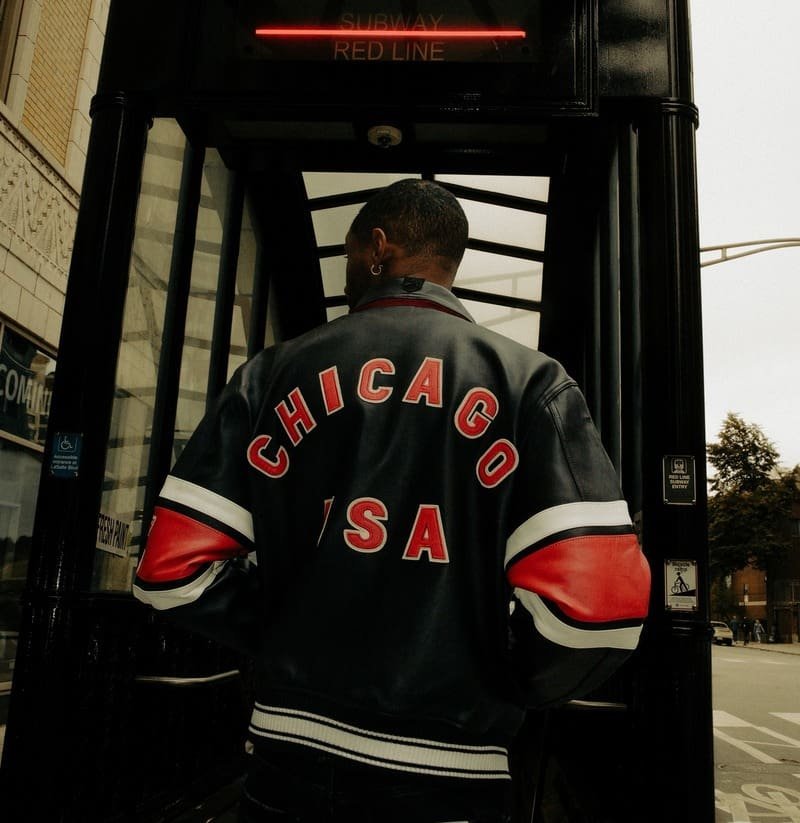 Limited Edition: Avirex Chicago USA leather jacket black & red in 100% antique European lamb leather with Chicago, IL art patch set and applique lining art. Wide stripe detailing on sleeves.