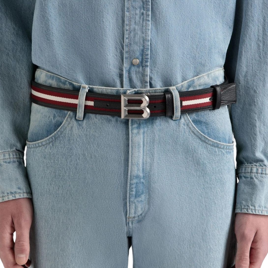 The Bally B Bold 35mm Reversible Belt in Red White Red Fabric and Leather is a stunning accessory that seamlessly blends luxury, functionality, and versatility. Crafted with meticulous attention to detail, this belt epitomizes Bally’s commitment to exquisite craftsmanship and timeless design. BALLY B BOLD 35MM REVERSIBLE BELT IN RED WHITE RED FABRIC AND LEATHER