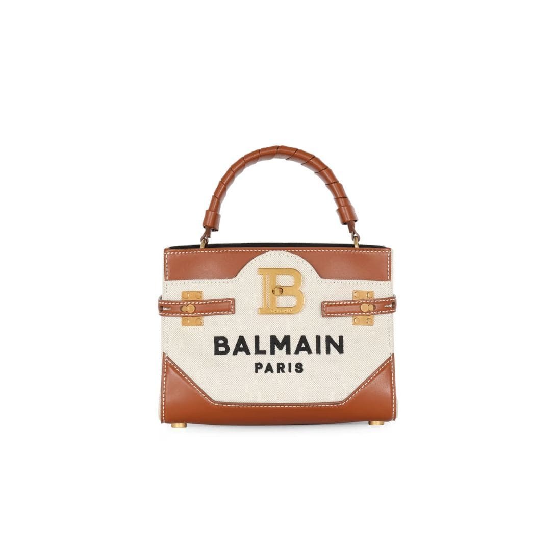 Introducing the Balmain B-Buzz 22 Canvas Top Handle Bag with leather insert, a testament to Balmain’s fusion of style and functionality.
