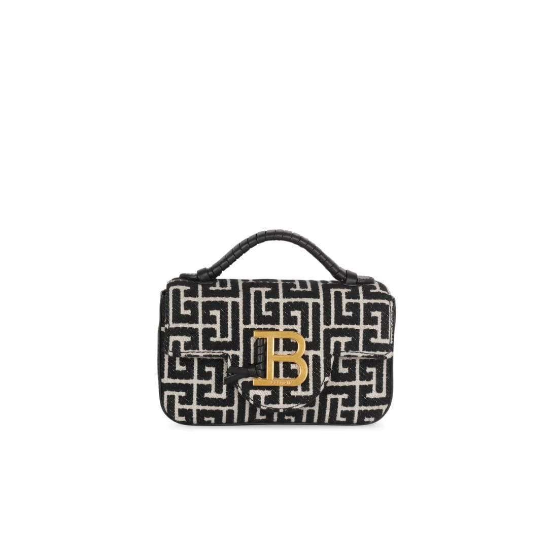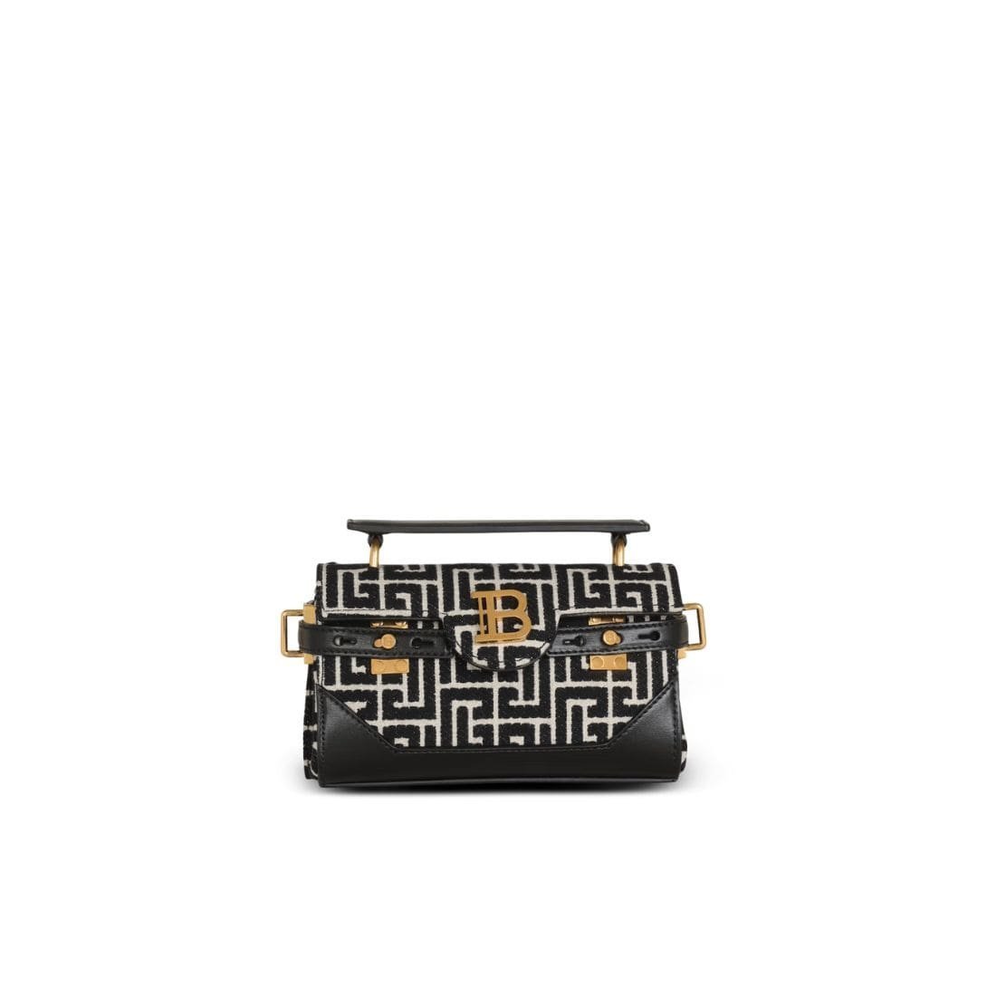 Introducing the Balmain B-Buzz 22 Top Handle bag in leather with jacquard monogram, a fusion of sophistication and style.