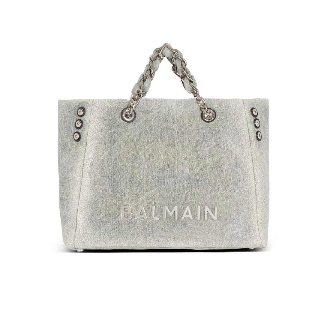 Featuring both a sturdy handle and a detachable shoulder strap adorned with Balmain’s signature engraved snap hooks, versatility meets elegance. The flap boasts a distinctive B-Twist quarter-turn clasp, adding a touch of sophistication to the design.