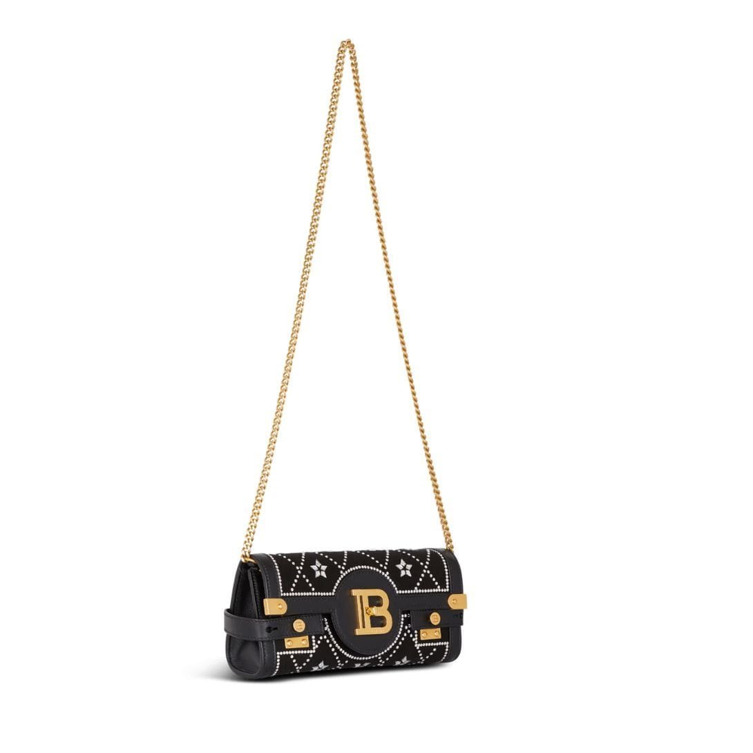 Introducing the glamorous balmain B-Buzz Pouch 23 satin and crystals Clutch, adorned with shimmering crystals and exquisite smooth leather detailing, a true embodiment of luxury and style.