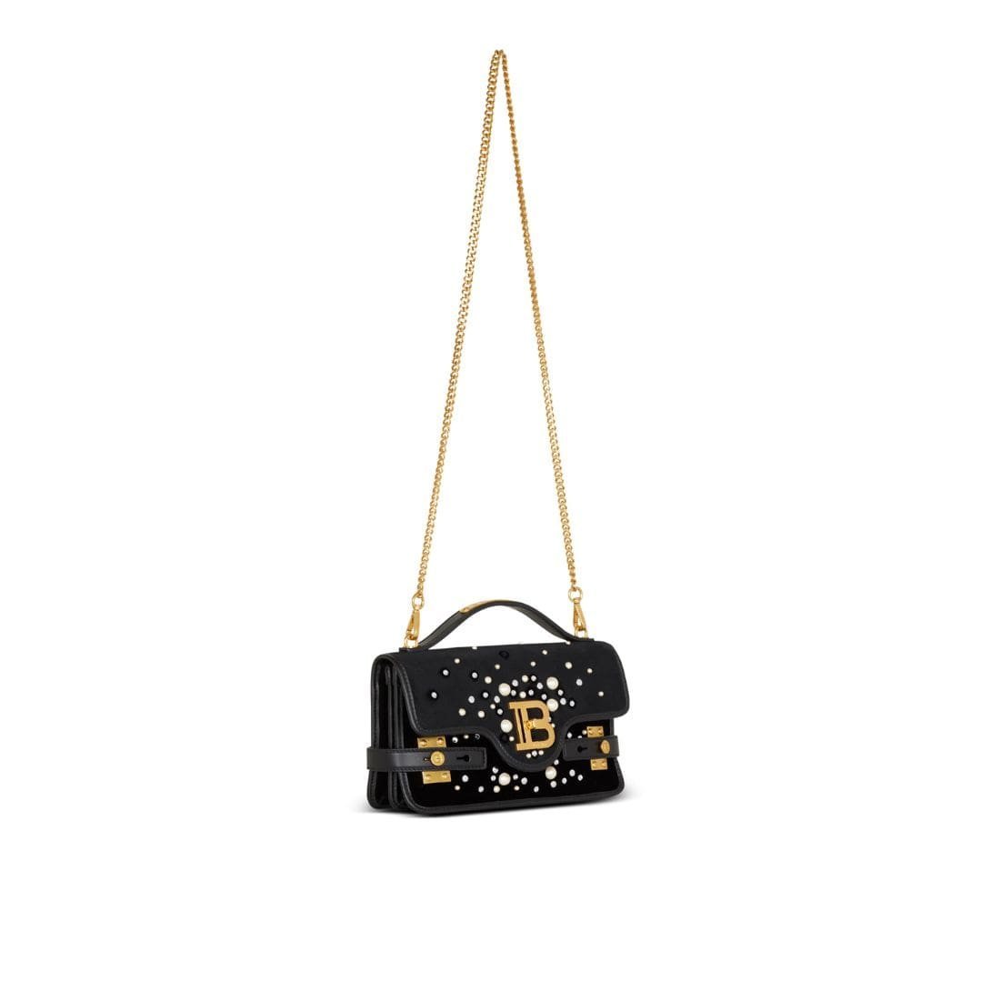 Features: Multi-material design with pearl and sequin embellished velvet, smooth leather details, thin removable leather shoulder strap, and handle, flap closure with B-Twist quarter-turn clasp, engraved golden metal Balmain B logo on the front, engraved golden metal Balmain plaque on the handle, two compartments, one card slot, patch pocket inside, golden hardware, smooth leather lining