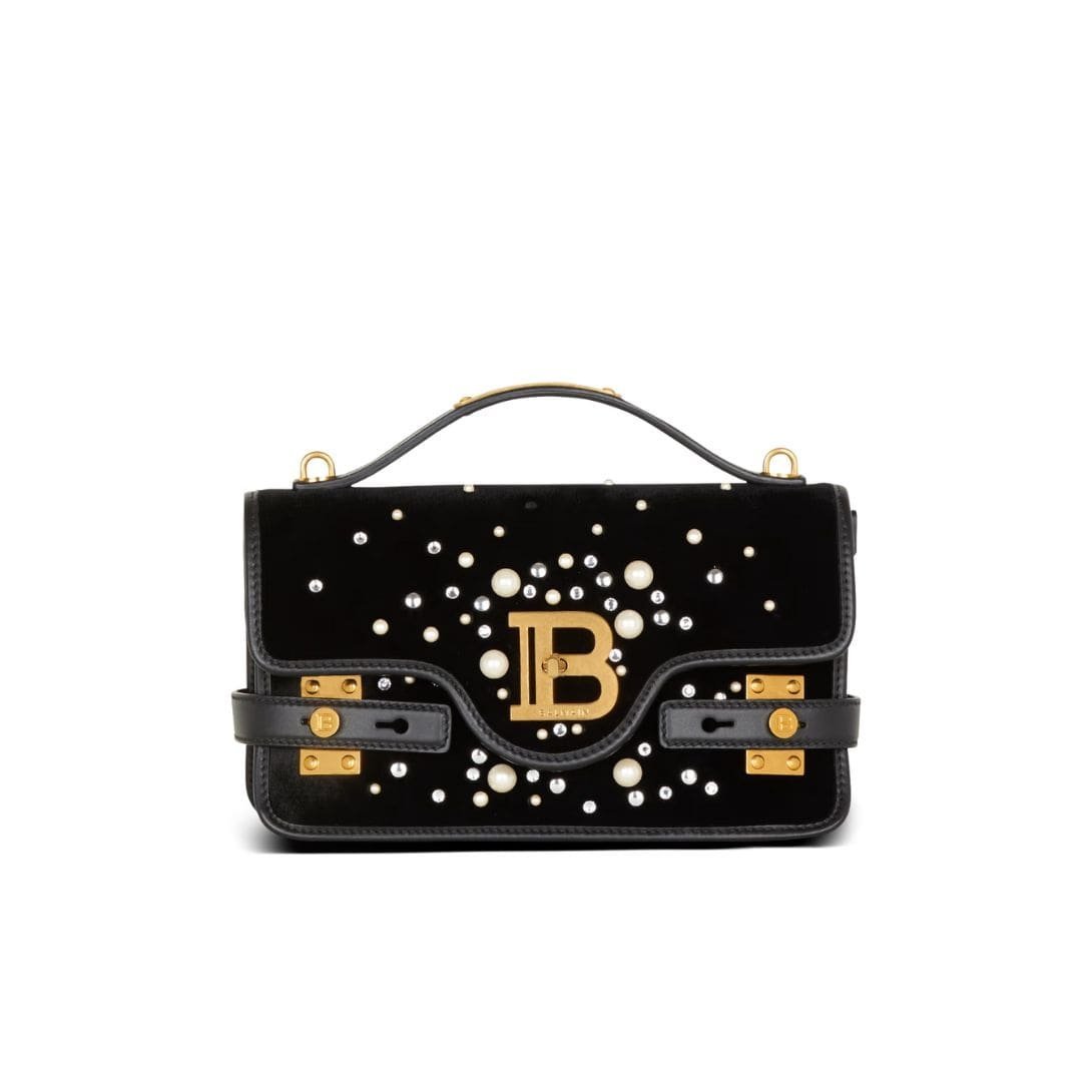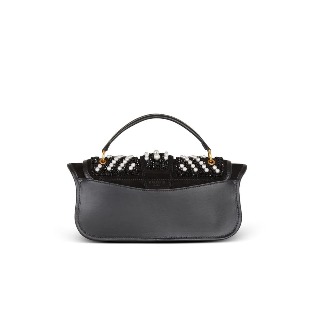 Introducing the stunning Balmain Blaze Pouch bag in beaded leather with a sleek smooth leather trim, a true embodiment of sophistication and style. Inspired by the iconic 6-button jacket, its elongated shape adds a touch of refinement to any ensemble, making it a must-have accessory for the fashion-forward individual.