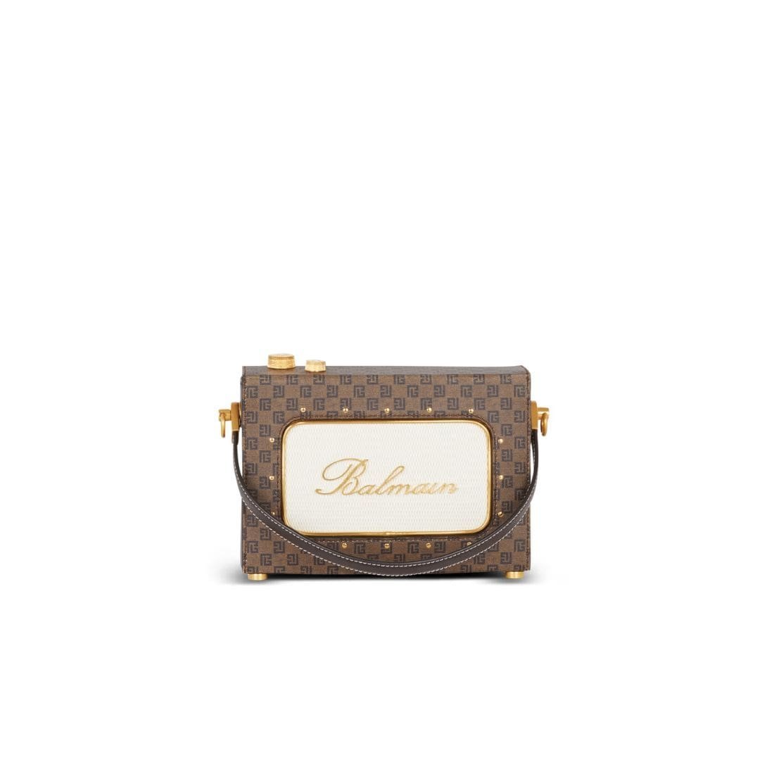 Introducing the striking Balmain Guitar bag clutch with leather and Monogram Detailing, a bold and stylish accessory designed to make a statement.