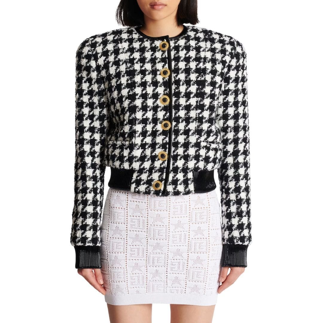 Versatility is key in the Balmain Houndstooth Tweed Jacket. Whether paired with tailored trousers for a polished office ensemble or draped over a little black dress for a night out, it effortlessly elevates any look with its understated sophistication and undeniable allure.