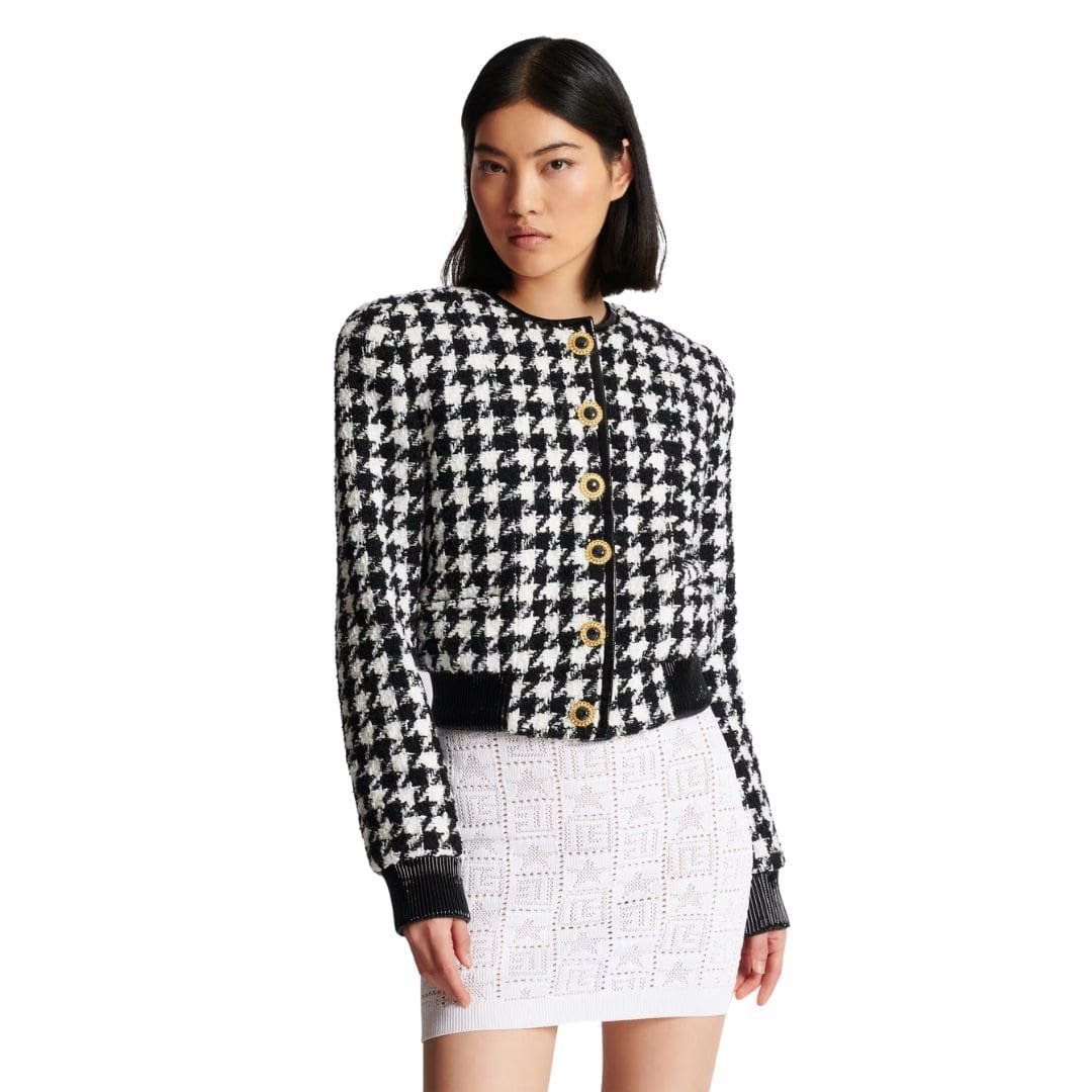 In essence, the Balmain Houndstooth Tweed Jacket is more than just a garment; it is a symbol of refined taste, timeless elegance, and the enduring legacy of one of fashion’s most esteemed houses. With its blend of heritage craftsmanship and contemporary design, it epitomizes the essence of luxury in every stitch.