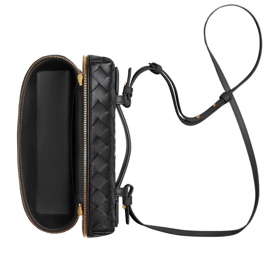Sleek, sculptural, and supremely functional — the Bang Bang Vanity Case blends Bottega Veneta’s signature Intrecciato leather craftsmanship with modern utility. Crafted from premium black leather and finished with rich gold-tone hardware, this case redefines elegance in compact form.