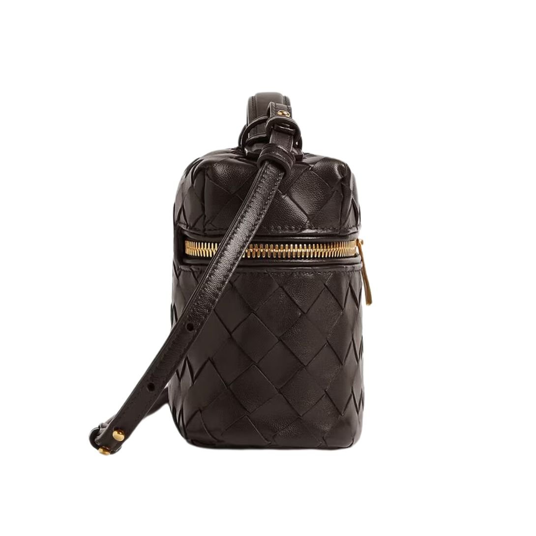Sleek, sculptural, and supremely functional — the Bang Bang Vanity Case blends Bottega Veneta’s signature Intrecciato leather craftsmanship with modern utility. Crafted from premium black leather and finished with rich gold-tone hardware, this case redefines elegance in compact form.