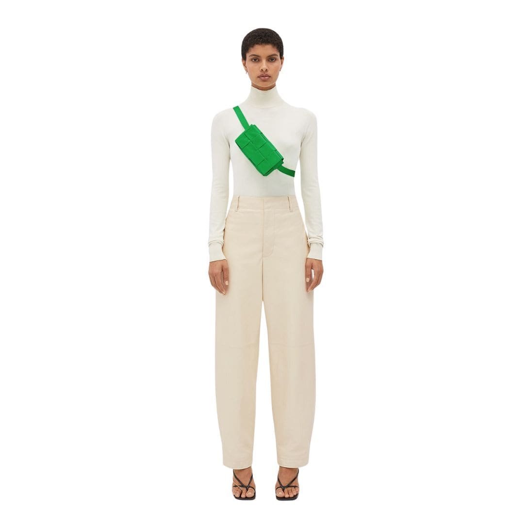 Constructed from supple calfskin leather, the Cassette Belt Bag boasts a smooth and buttery texture that exudes refinement. Its sleek silhouette is accentuated by the iconic Intrecciato weave, a signature technique of Bottega Veneta that adds depth and dimension to the bag’s exterior, while also ensuring durability and longevity.