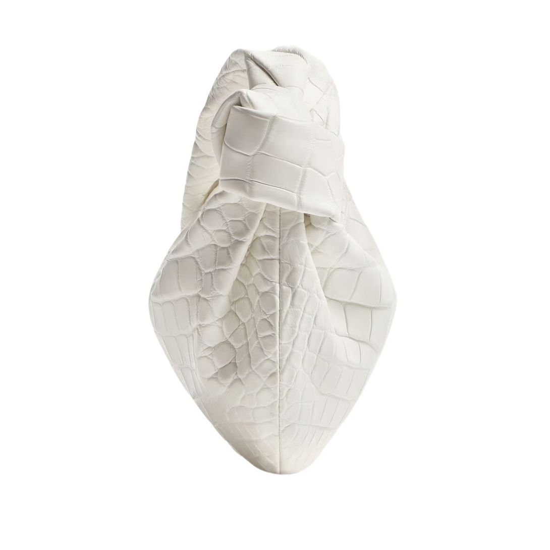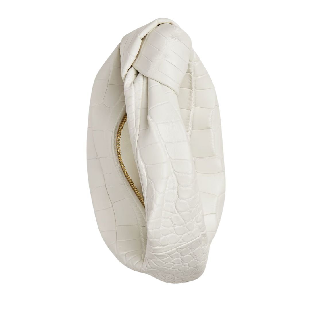 Sleek and sculptural, the Mini Jodie Tote by Bottega Veneta exudes refined sophistication. Handcrafted in exquisite alligator leather, this compact top-handle bag showcases the iconic knot detail and softly curved silhouette that defines the Jodie line.