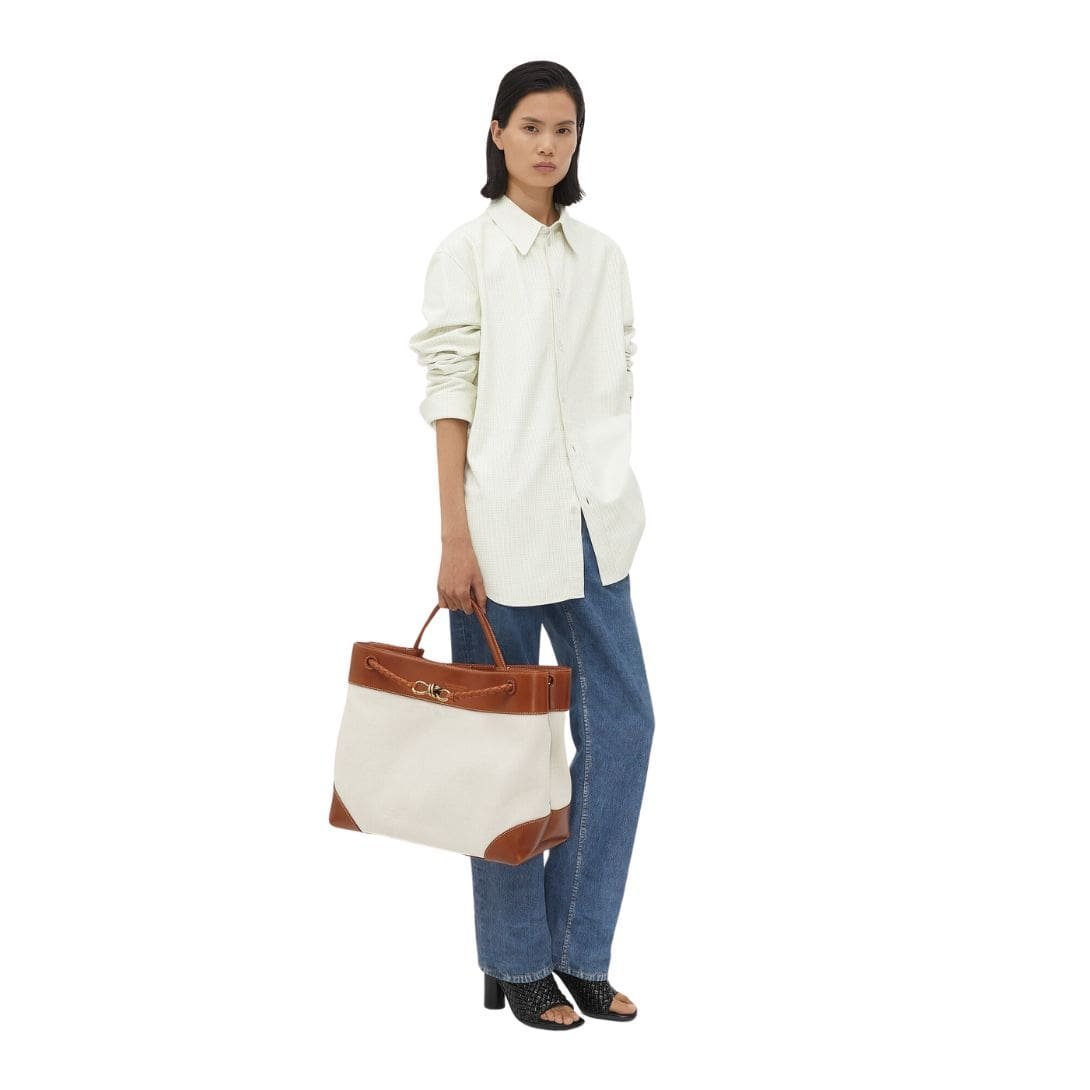 The Bottega Veneta Large Andiamo Bag is an epitome of timeless elegance and sophisticated craftsmanship, embodying the brand’s ethos of understated luxury. With meticulous attention to detail and expert Italian artisanship, this spacious tote exudes refinement and practicality in equal measure.
