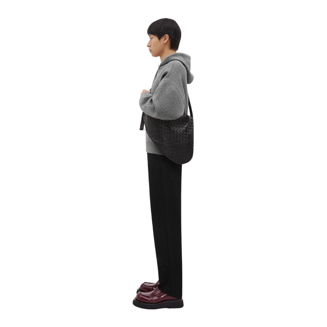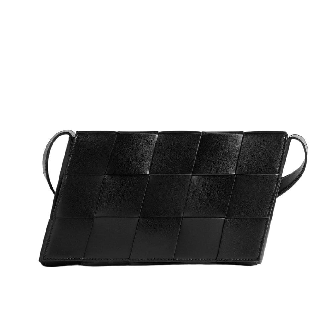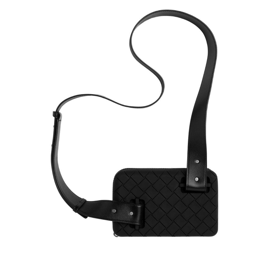 The minimalist design of the clutch is accentuated by subtle yet distinctive details. The iconic Bottega Veneta Intrecciato pattern, rendered in precise relief, adorns the surface, adding a touch of artisanal craftsmanship to the modern aesthetic. The brand’s signature matte black hardware provides a striking contrast, elevating the overall allure of the accessory.