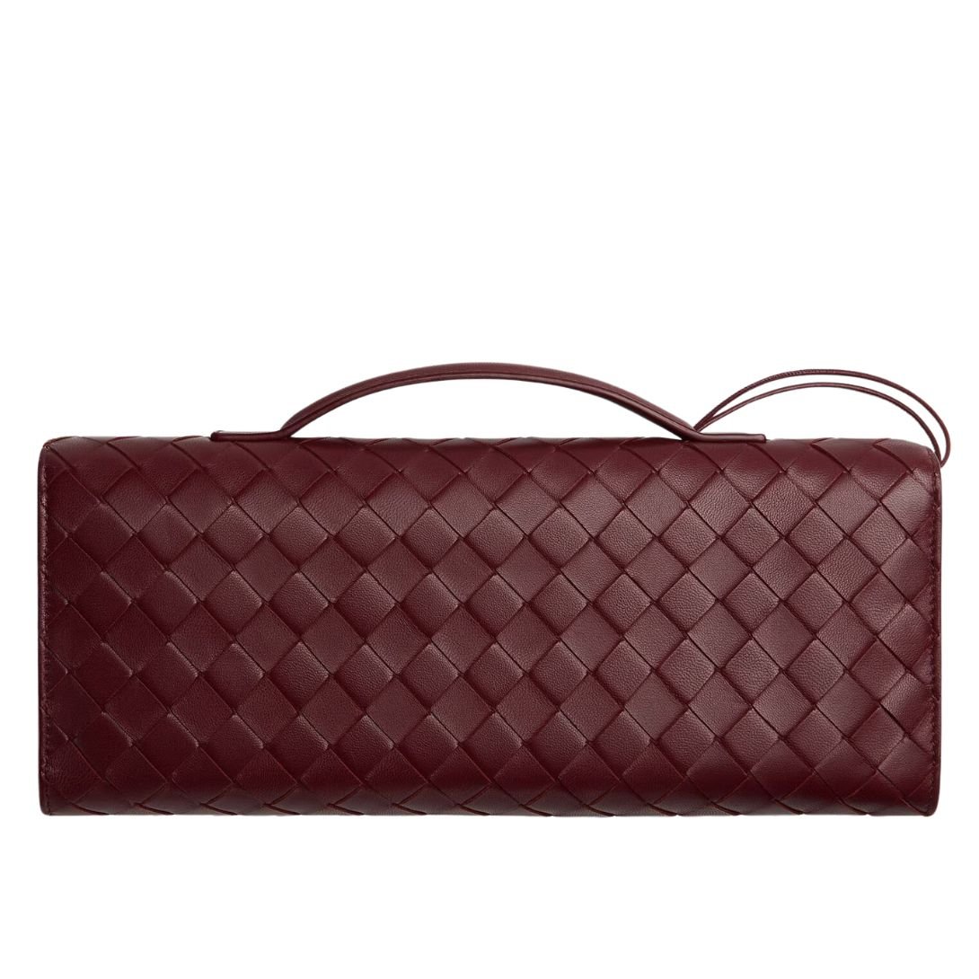 A statement in refined minimalism, the Andiamo Clutch from Bottega Veneta blends craftsmanship and elegance in a timeless silhouette. Crafted in supple lambskin Intrecciato leather, this top-handle clutch showcases the brand’s iconic weaving technique, accented by a signature metallic knot closure that adds a sculptural touch.