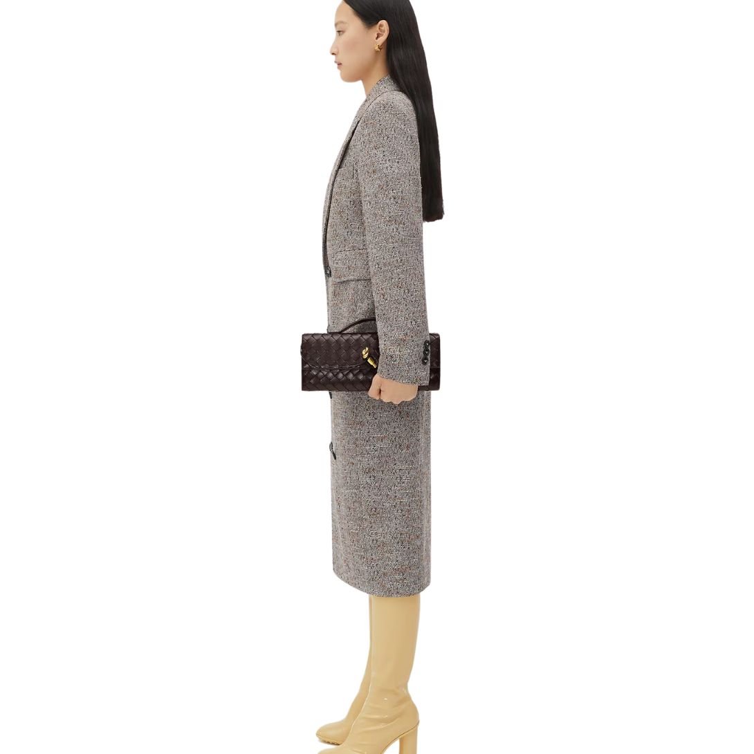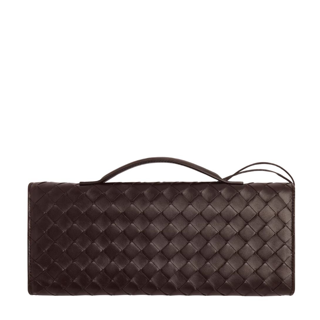 A statement in refined minimalism, the Andiamo Clutch from Bottega Veneta blends craftsmanship and elegance in a timeless silhouette. Crafted in supple lambskin Intrecciato leather, this top-handle clutch showcases the brand’s iconic weaving technique, accented by a signature metallic knot closure that adds a sculptural touch.