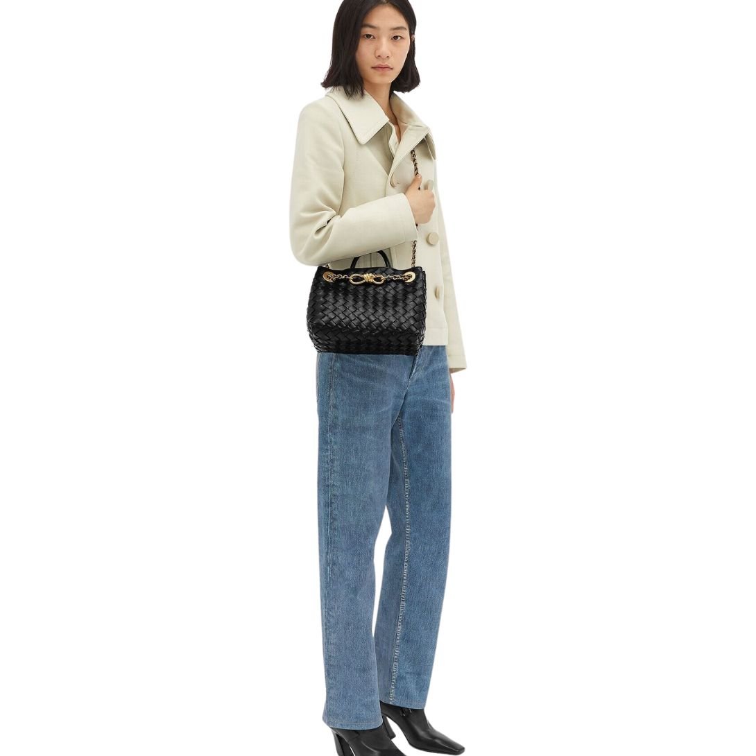 This small top handle bag is a refined expression of Italian craftsmanship, realized in supple Intrecciato leather. Known for its iconic woven design, the bag combines classic elegance with a modern silhouette, perfect for sophisticated everyday wear.