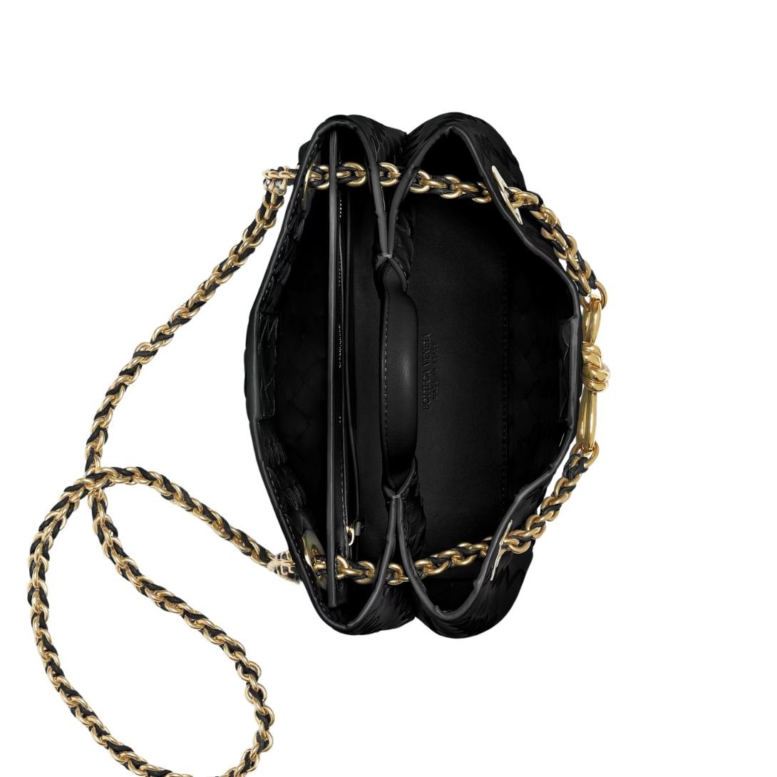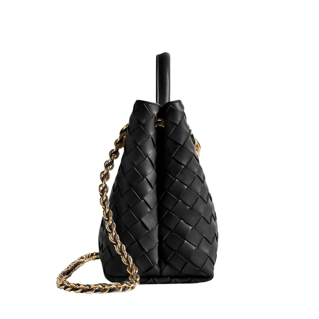 The bag features a fully lambskin bonded Intrecciato lining, ensuring a smooth, luxurious feel inside and out. The classic black color is elevated by the brass-finish hardware, offering a rich, timeless contrast.
