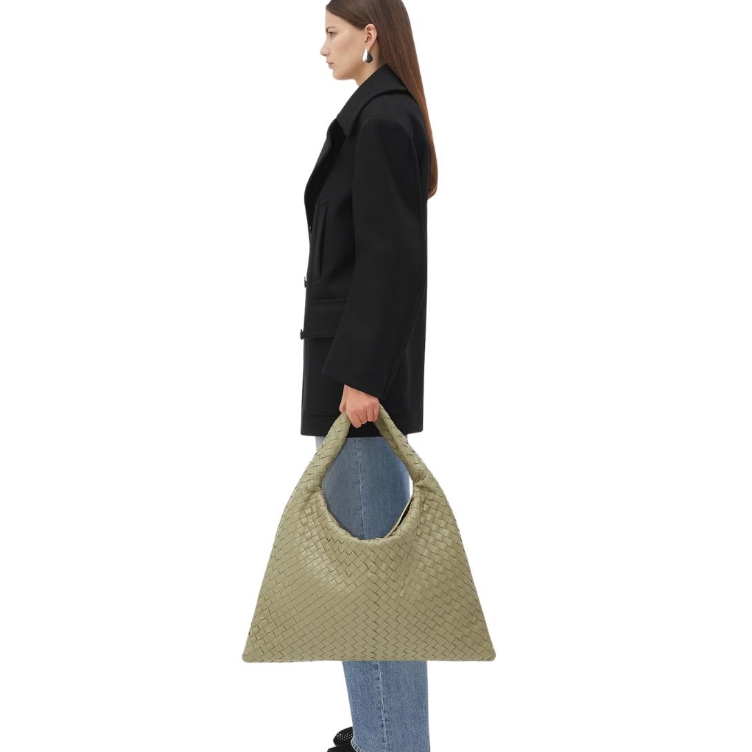 Exuding understated sophistication, the Large Hop Shoulder Bag by Bottega Veneta is a sculptural statement in suede-finished Intrecciato calf leather. Its generous proportions and fluid silhouette strike the perfect balance between modern edge and timeless elegance.