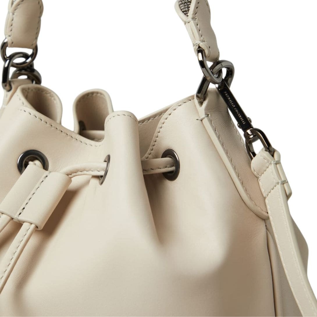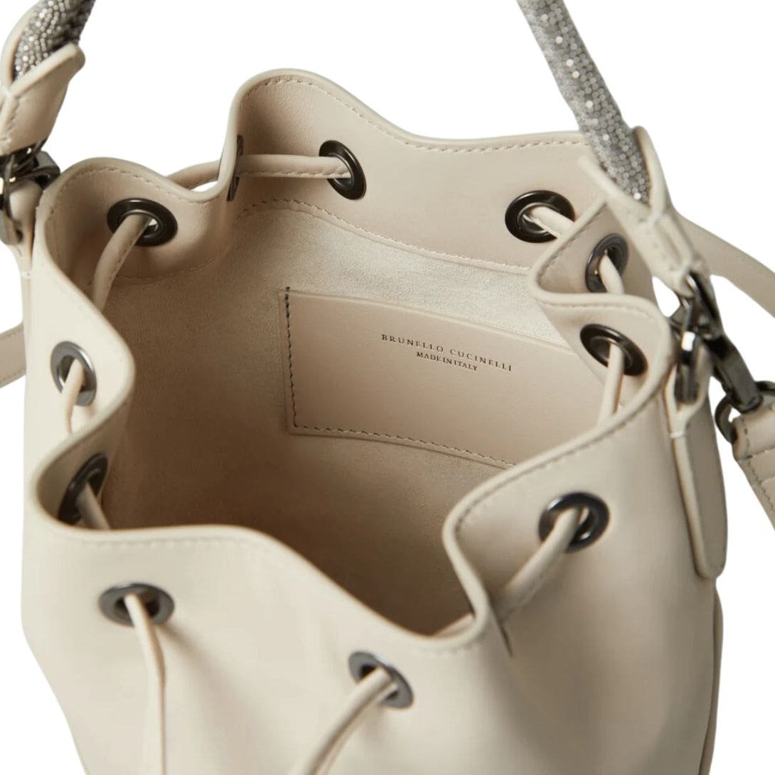 The classic Brunello Cucinelli Calfskin Bucket bag precious braided handle silhouette takes on a contemporary twist with the distinctive materials and details of  showcased in this latest bag design. Crafted from soft, subtly lustrous Nappa leather, the surface of the accessory exudes sophistication. Adding an extra touch of elegance, a Monili decoration adorns the handle, lending a refined and sparkling accent to the overall style. For practicality, a detachable shoulder strap is included, offering versatility in wear.