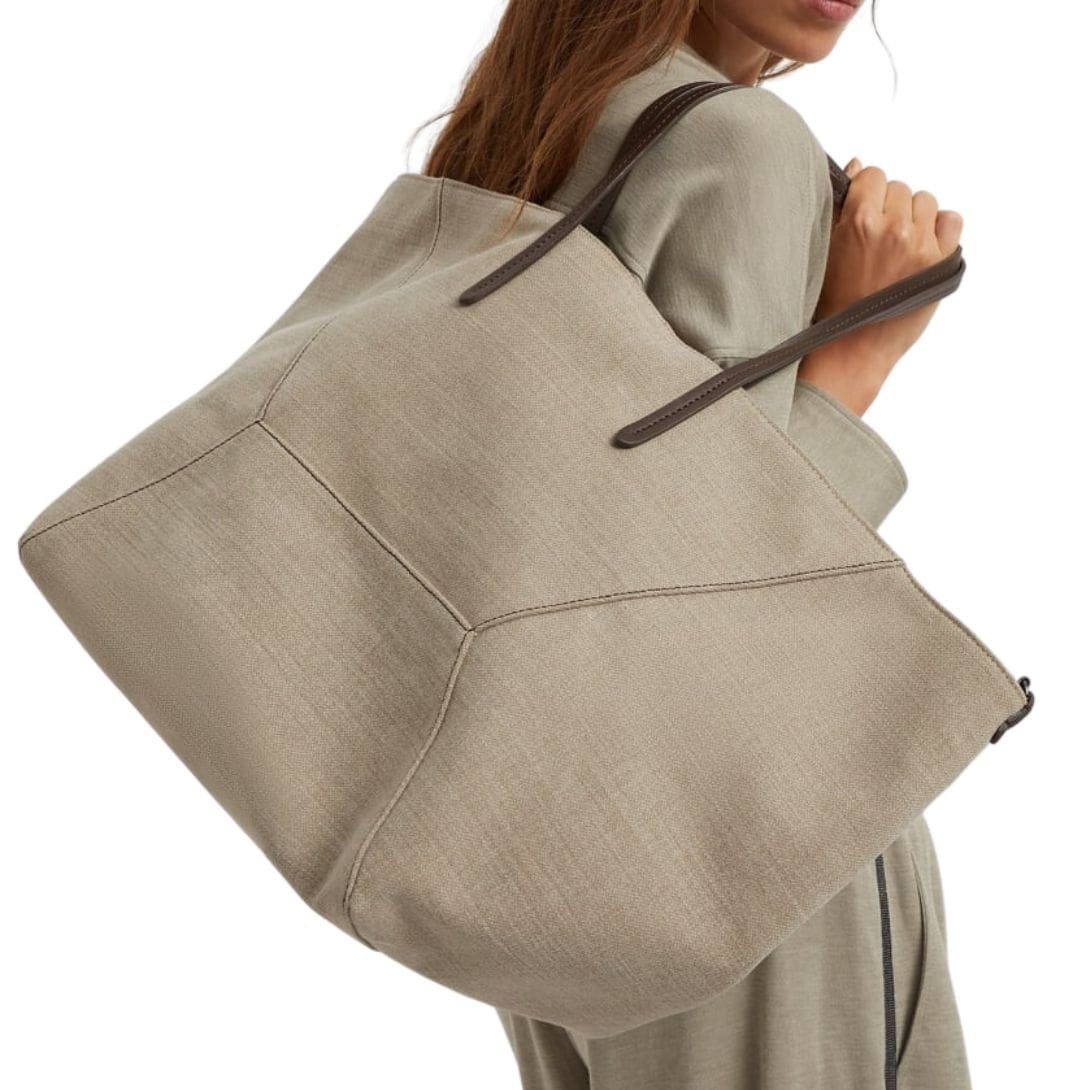 Refined materials and artisanal craftsmanship imbue this Brunello Cucinelli Cotton and Linen Canvas shopper bag with Monili with a sophisticated yet summery touch. The “raw” texture of the cotton and linen canvas fabric presents a dry, slightly mottled appearance, contrasting with the smooth surface of the leather used for the wide handles, making carrying the accessory easy. Two small Monili details on the sides complete the design. Additionally, two internal ties allow the bag’s shape to be modified for a more compact look when fastened.