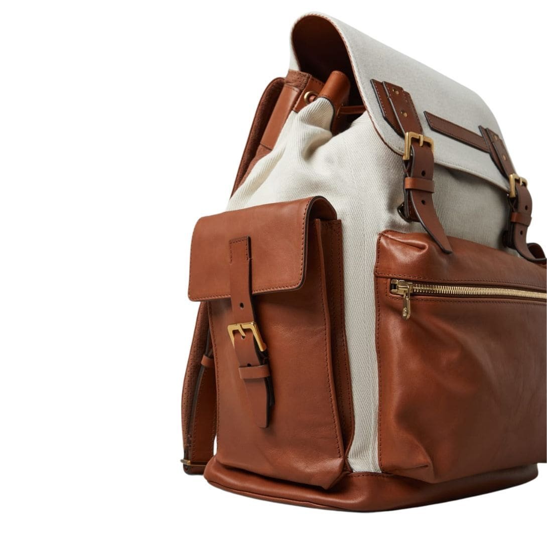 The backpack’s exterior showcases a sophisticated cavalry-inspired design, characterized by its understated military aesthetic. The cotton-linen blend fabric exudes a timeless charm while maintaining a lightweight and breathable quality, making it ideal for both urban commutes and casual outings. The calfskin leather, meticulously selected for its soft yet resilient nature, is used for the trims and detailing, adding a touch of opulence and enhancing the backpack’s overall durability.