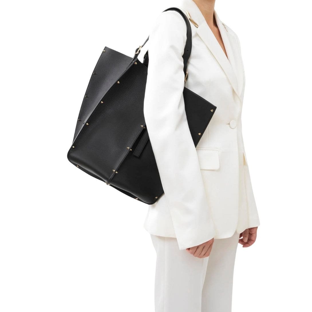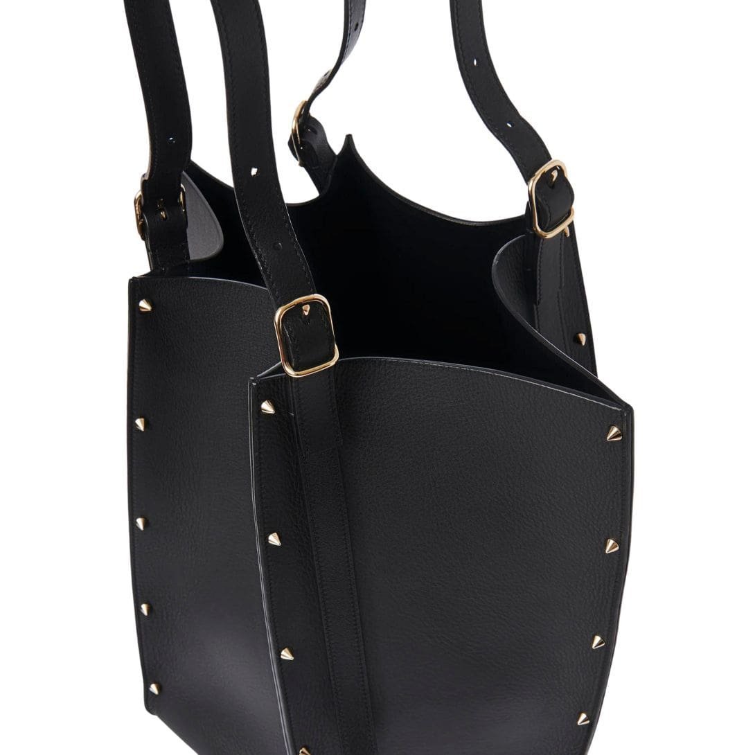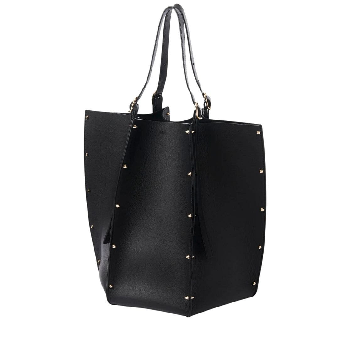 Step into the realm of timeless sophistication with the large CHLOE Carmela Tote Bag Black, a captivating fusion of modern design and luxurious craftsmanship. Crafted from exquisite-grained bull skin, this statement accessory exudes an aura of understated elegance, elevated by the line’s signature spike studs that adorn its exterior, effortlessly catching and reflecting the light with every movement.