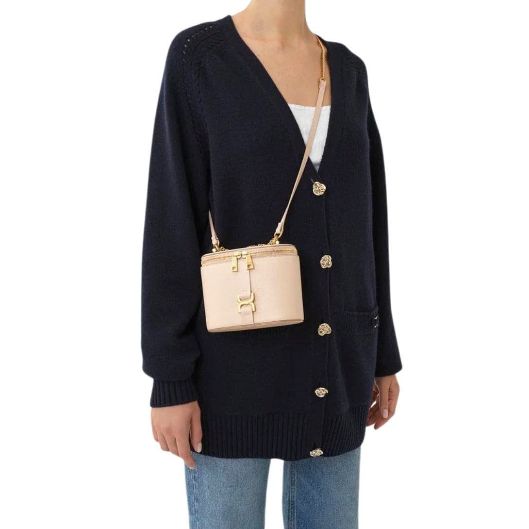 Chloé introduces the Chloe Marcie Mini Vanity on Chain Cement Pink. as a charming addition to its iconic Marcie line, offering a blend of elegance and practicality. Crafted from luxurious grained calfskin leather and adorned with gold-toned hardware, this miniature vanity exudes sophistication.