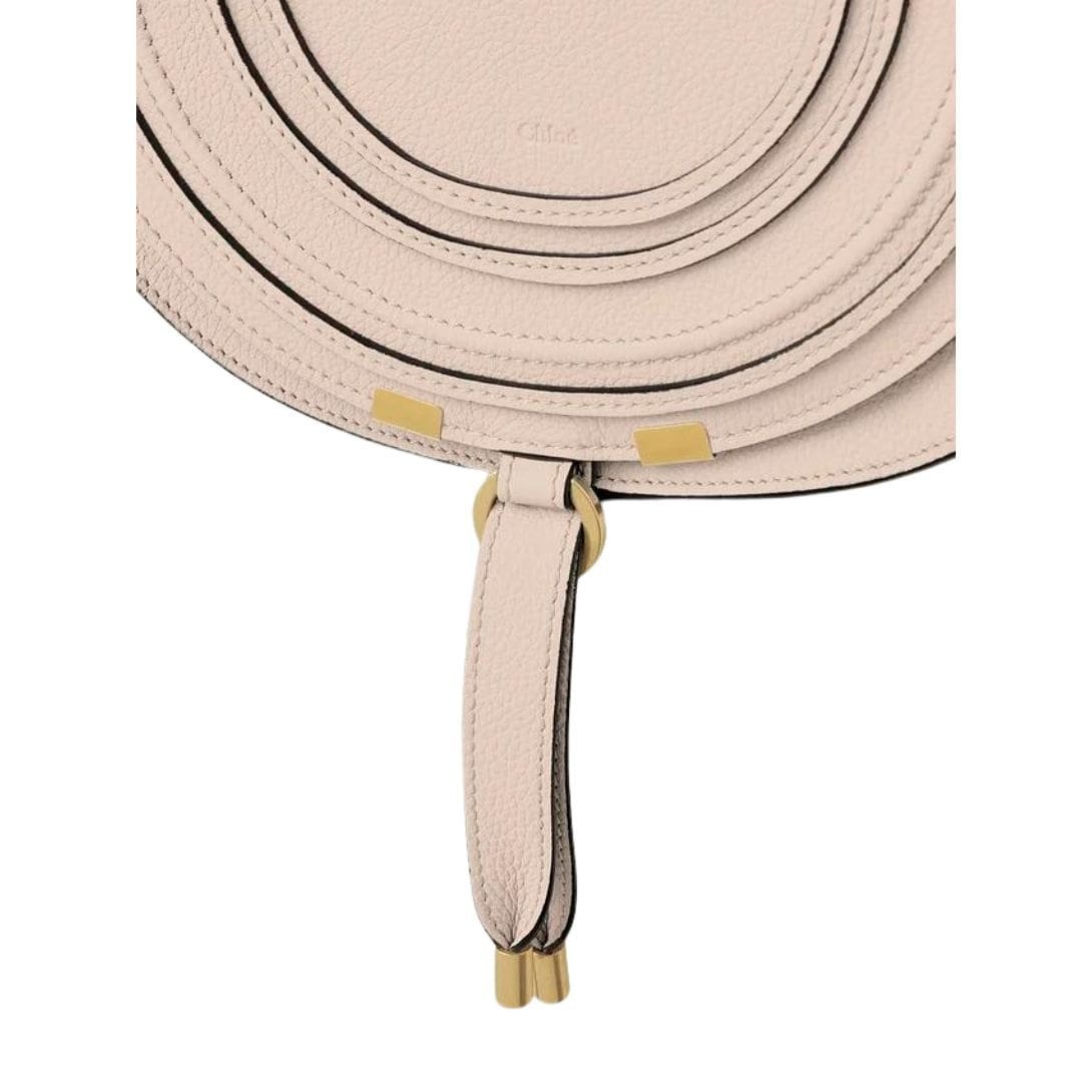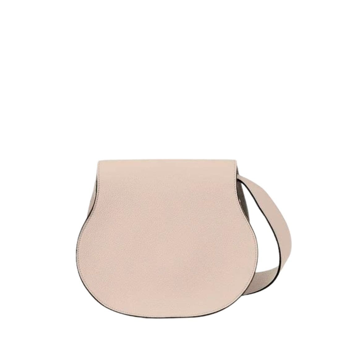 Exemplifying the quintessential Chloe Marcie Saddle Bag In Grained Leather Cement Pink. style, the spacious saddle bag crafted from grained calfskin embodies understated luxury with its rounded silhouette. Its capacious interior offers ample room to stow away all your essentials seamlessly, while the adjustable and removable strap provides versatility in carrying options, whether elegantly slung over the shoulder, held by hand, or worn across the body.