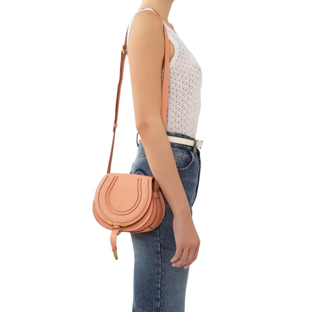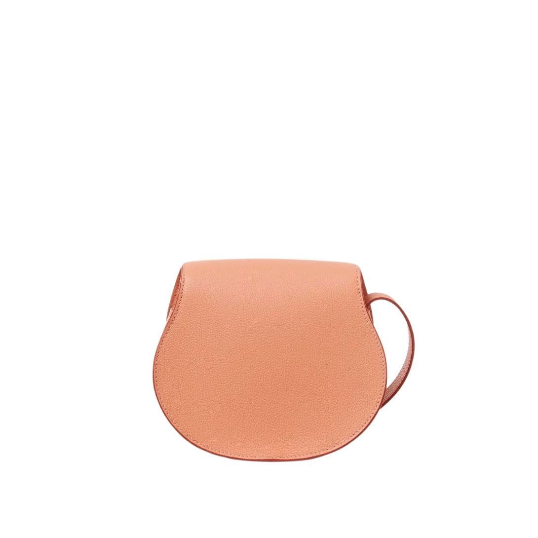 The CHLOE Marcie Small Saddle Bag Terracotta Pink, meticulously crafted from premium-grained calfskin, epitomizes the sophisticated fusion of masculine and feminine elements emblematic of Maison’s design ethos. Its distinctive clean top-line seamlessly melds with a rounded silhouette, offering a timeless allure that effortlessly transitions from day to evening.