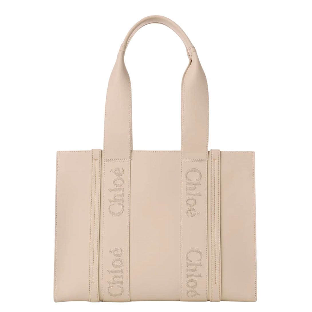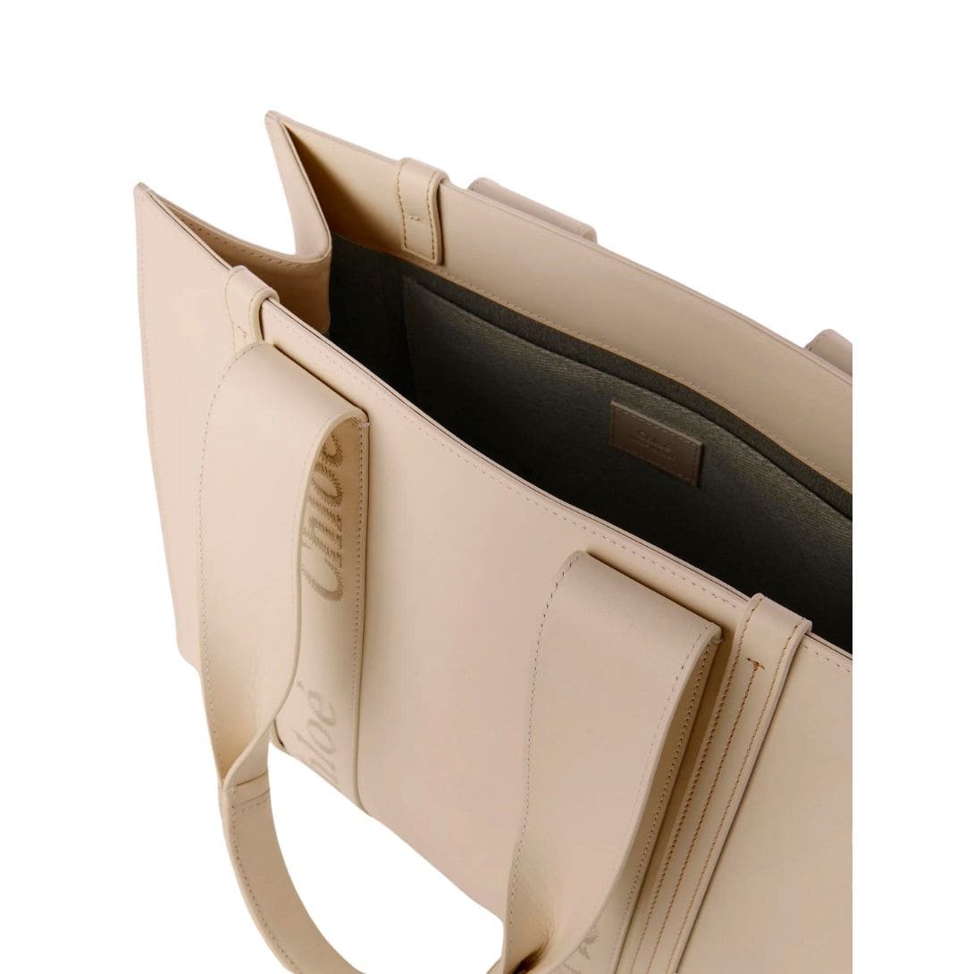 The Woody tote bag’s design is a study in modern minimalism, characterized by its clean lines and understated detailing. Vertical leather strips accentuate its sleek silhouette, while the signature Chloé logo, borrowed from the Maison’s iconic mules, adds a touch of subtle branding. Rendered in tonal embroidery on the supple calfskin, the logo serves as a nod to the bag’s heritage and craftsmanship.