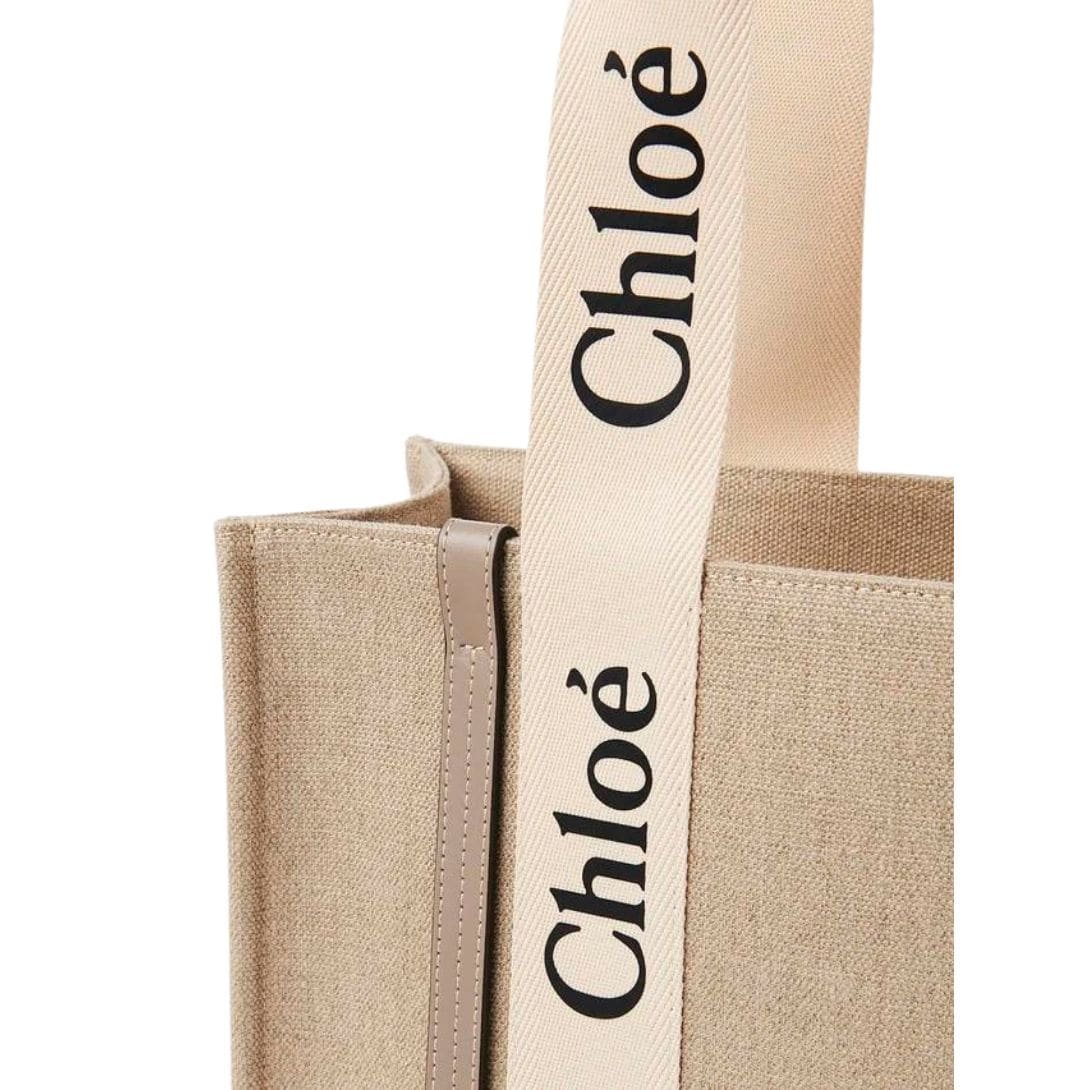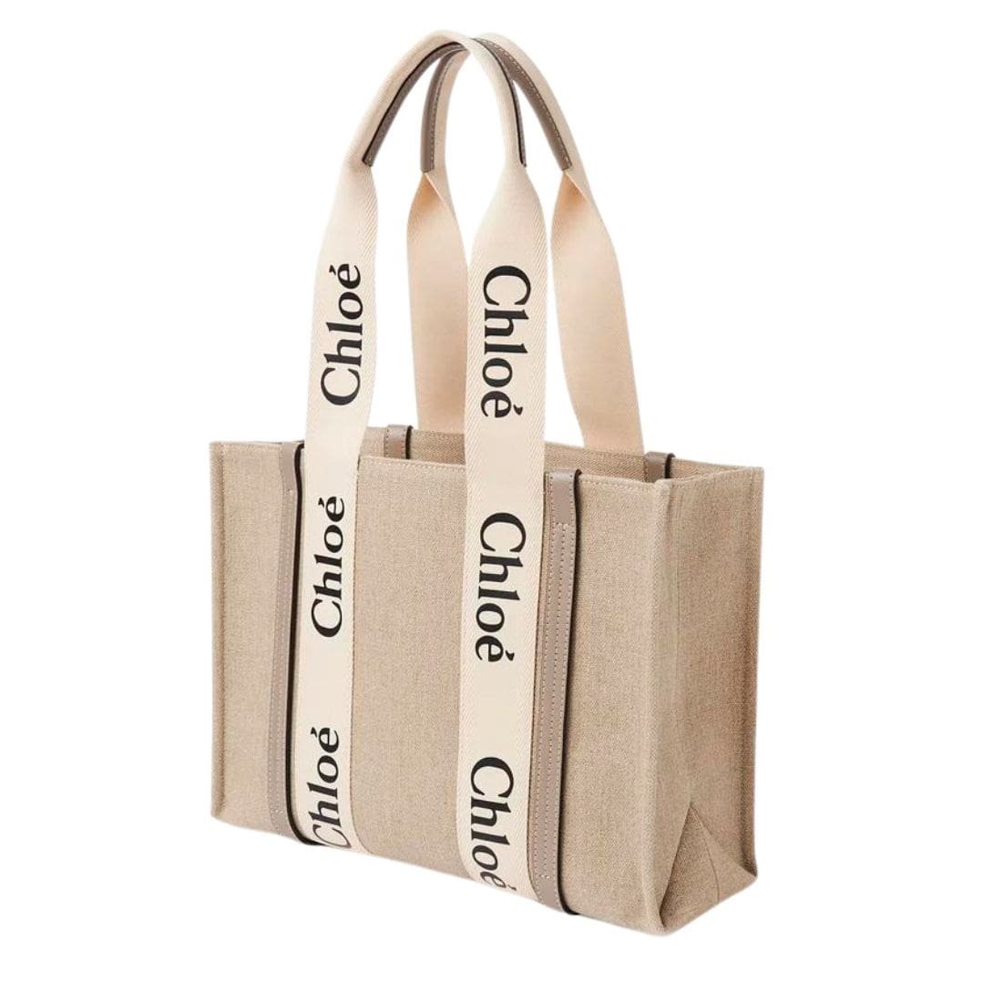 The Chloe Medium Woody Tote Bag Musk Grey. seamlessly marries functionality with a chic, contemporary aesthetic. Crafted from linen canvas intricately detailed with shiny calfskin strips, this tote bag exudes a bold summer attitude, making it an essential accessory for the modern woman seeking both style and practicality.