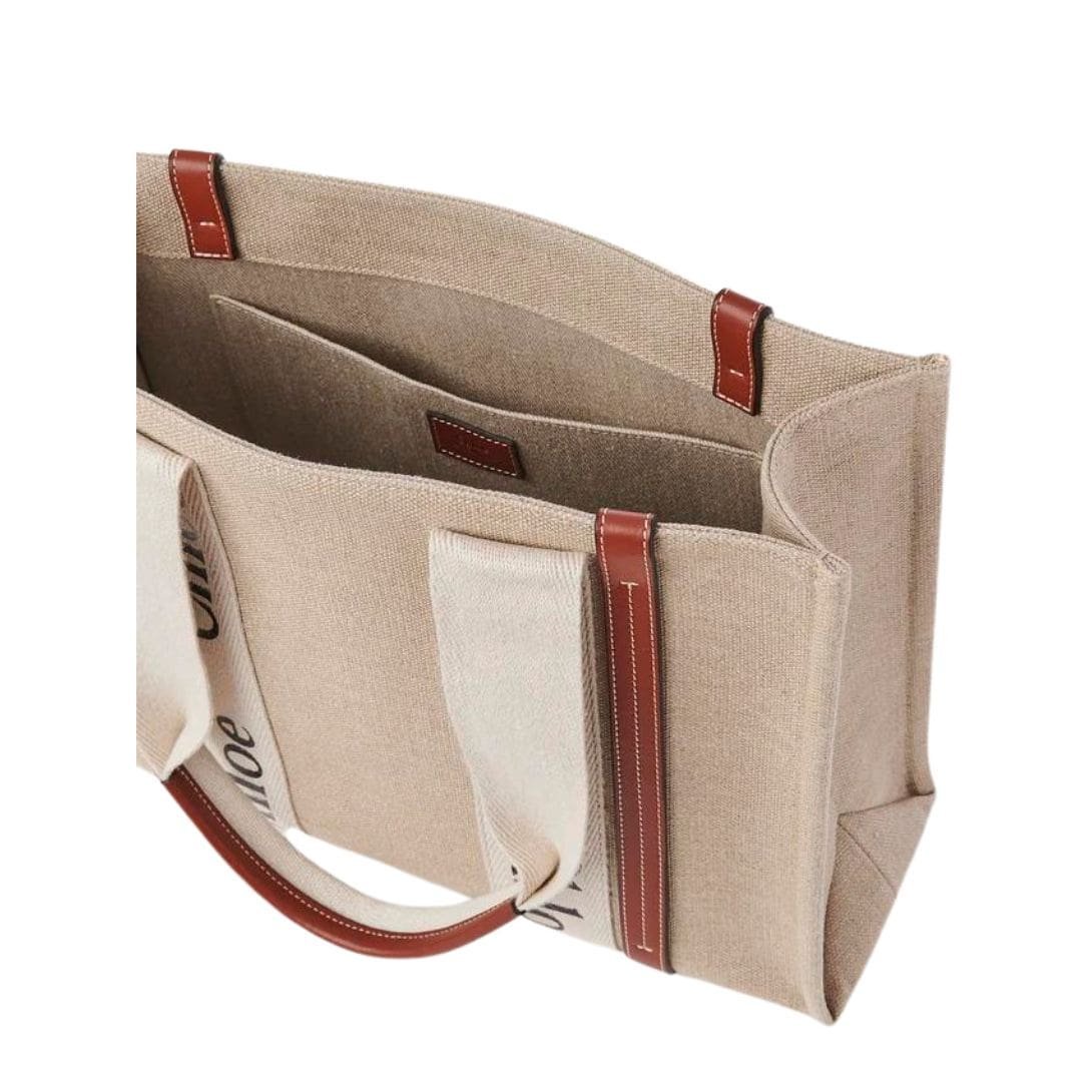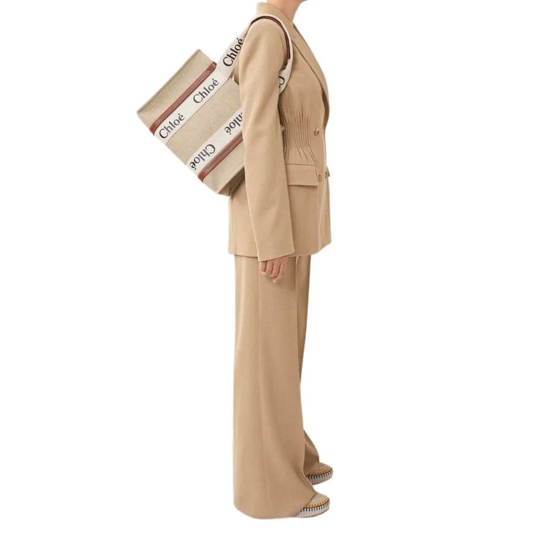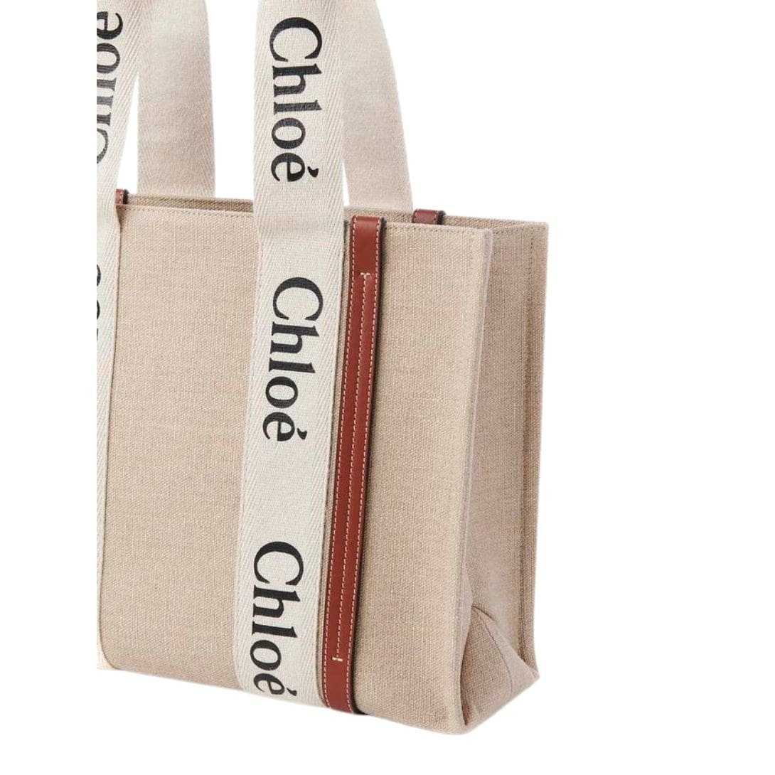 The Chloe Medium Woody Tote Bag White & Brown. by Chloe epitomizes summer sophistication, crafted from lower-impact linen canvas adorned with shiny calfskin strips. This spacious tote exudes a vibrant summer attitude while maintaining Chloe’s signature elegance and functionality.