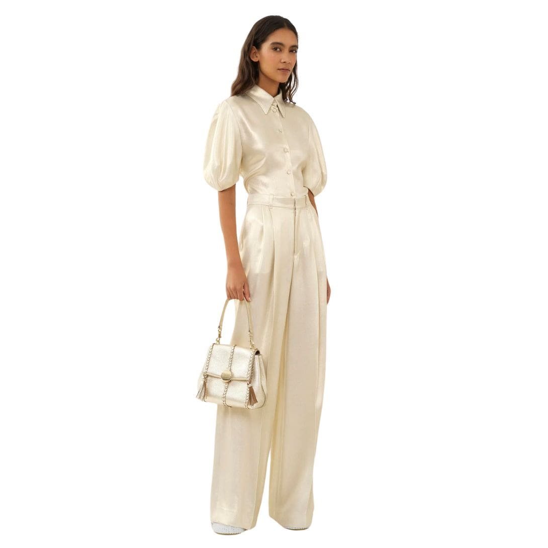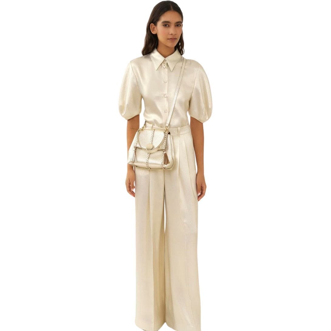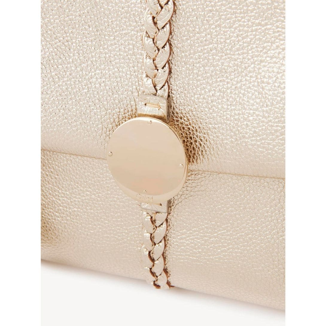 Step into the realm of sophisticated glamour with the CHLOE Penelope Small Soft Shoulder Bag Light Gold, a captivating creation crafted from metallic calfskin to infuse your ensemble with a festive mood and a touch of effortless elegance. Embodying the essence of femininity and loyalty, inspired by Homer’s iconic character Penelope from the Odyssey, this exquisite accessory exudes timeless allure and refined craftsmanship rooted in the DNA of Chloé.