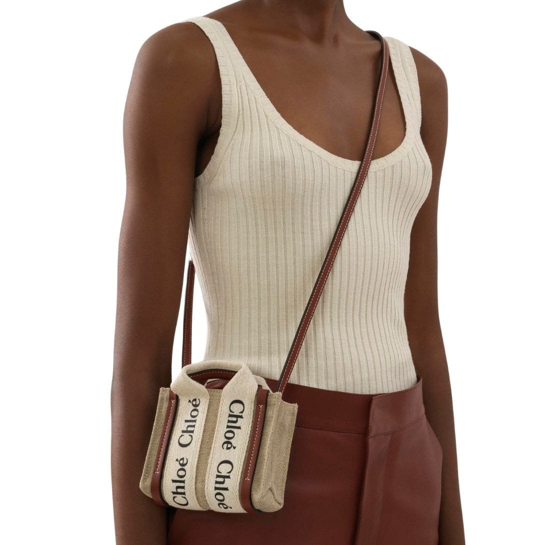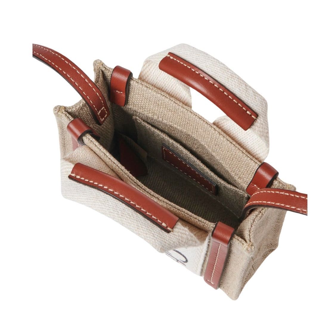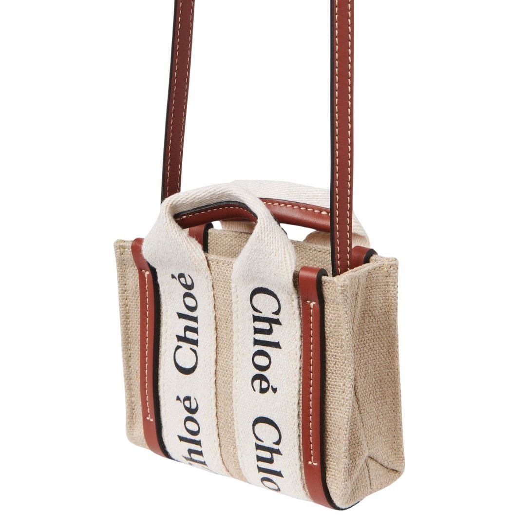 Exuding the essence of timeless elegance in a compact form, the CHLOE Woody Nano Tote White And Brown epitomizes sophistication and functionality. Crafted with meticulous attention to detail, this miniature rendition of the iconic Woody line showcases a seamless blend of linen canvas and lustrous calfskin accents, epitomizing Chloe’s dedication to refined craftsmanship and sustainable sourcing.