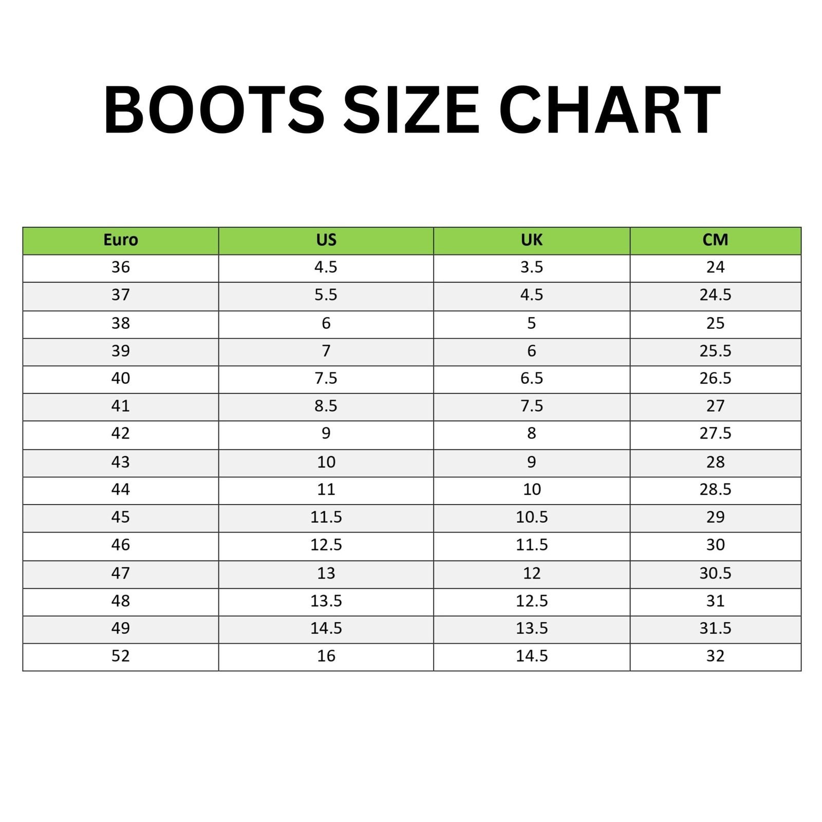 | Size | EU 36 – US 4.5 – UK 3.5, EU 37 – US 5.5 – UK 4.5, EU 38 – US 6 – UK 5, EU 39 – US 7 – UK 6, EU 40 – US 7.5 – UK 6.5, EU 41 – US 8.5 – UK 7.5, EU 42 – US 9 – UK 8, EU 43 – US 10 – UK 9, EU 44 – US 11 – UK 10, EU 45 – US 11.5 – UK 10.5, EU 46 – US 12.5 – UK 11.5, EU 47 – US 13 – UK 12, EU 48 – US 13.5 – UK 12.5, EU 49 – US 14.5 – UK 13.5, EU 52 – US 16 – UK 14.5, MADE TO MEASURE |