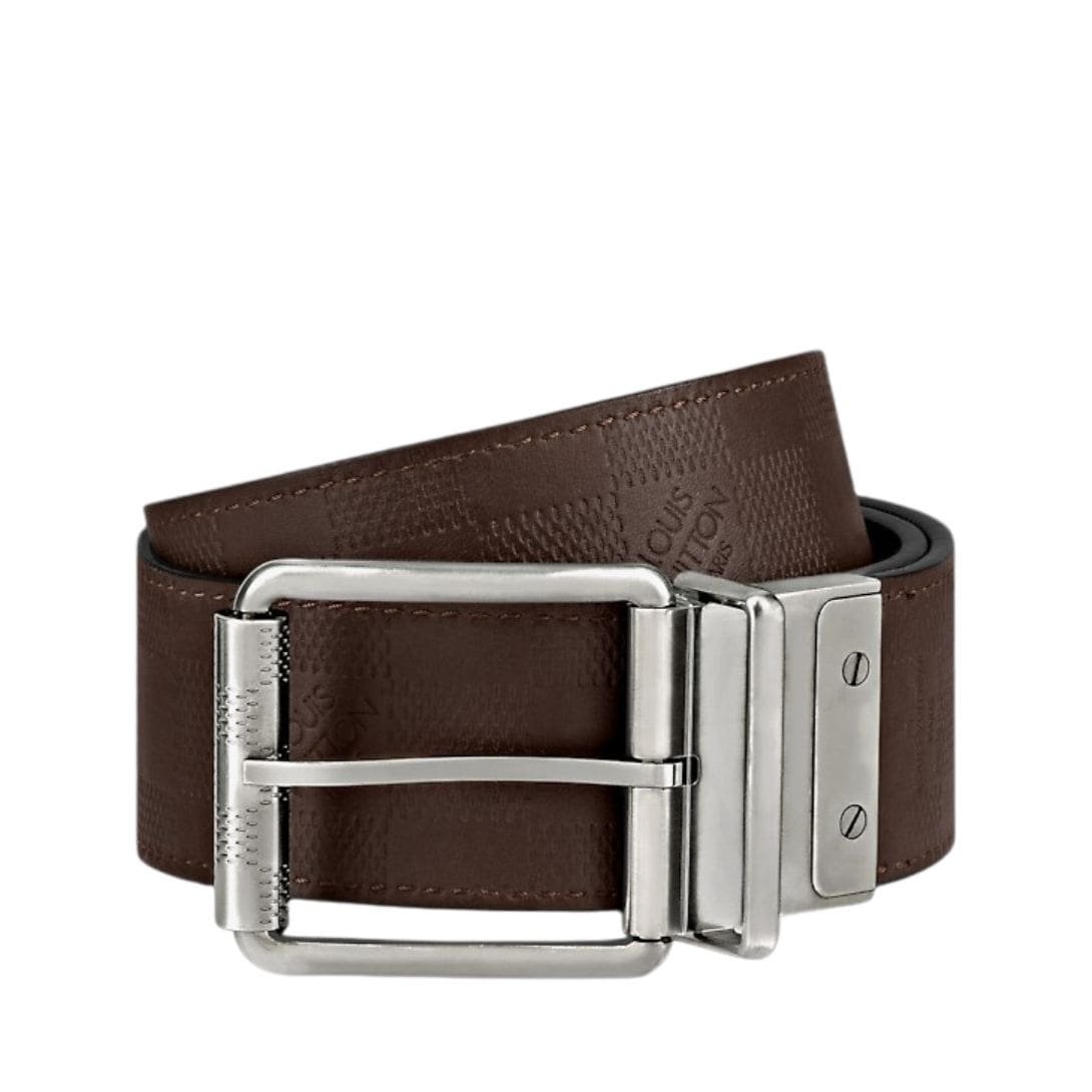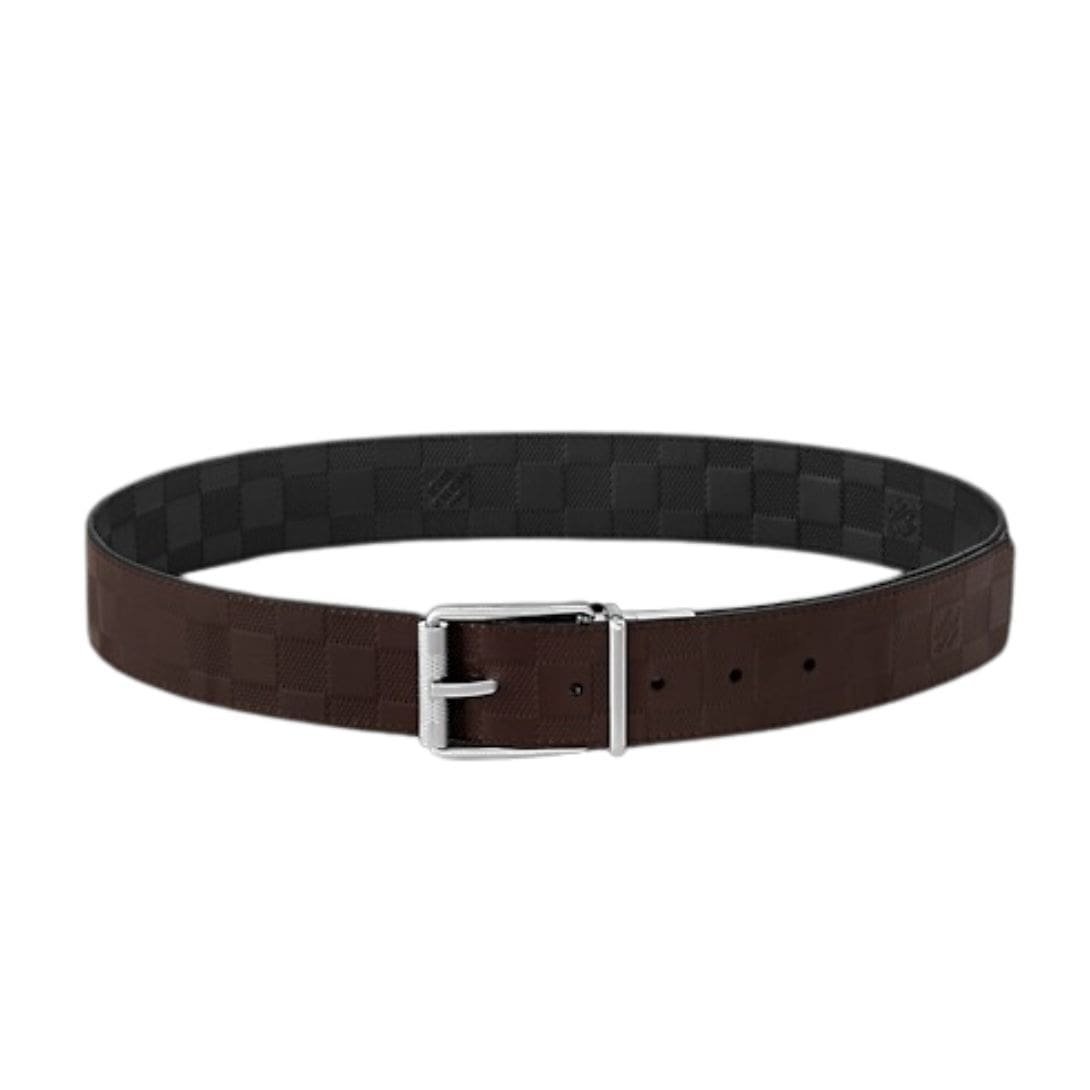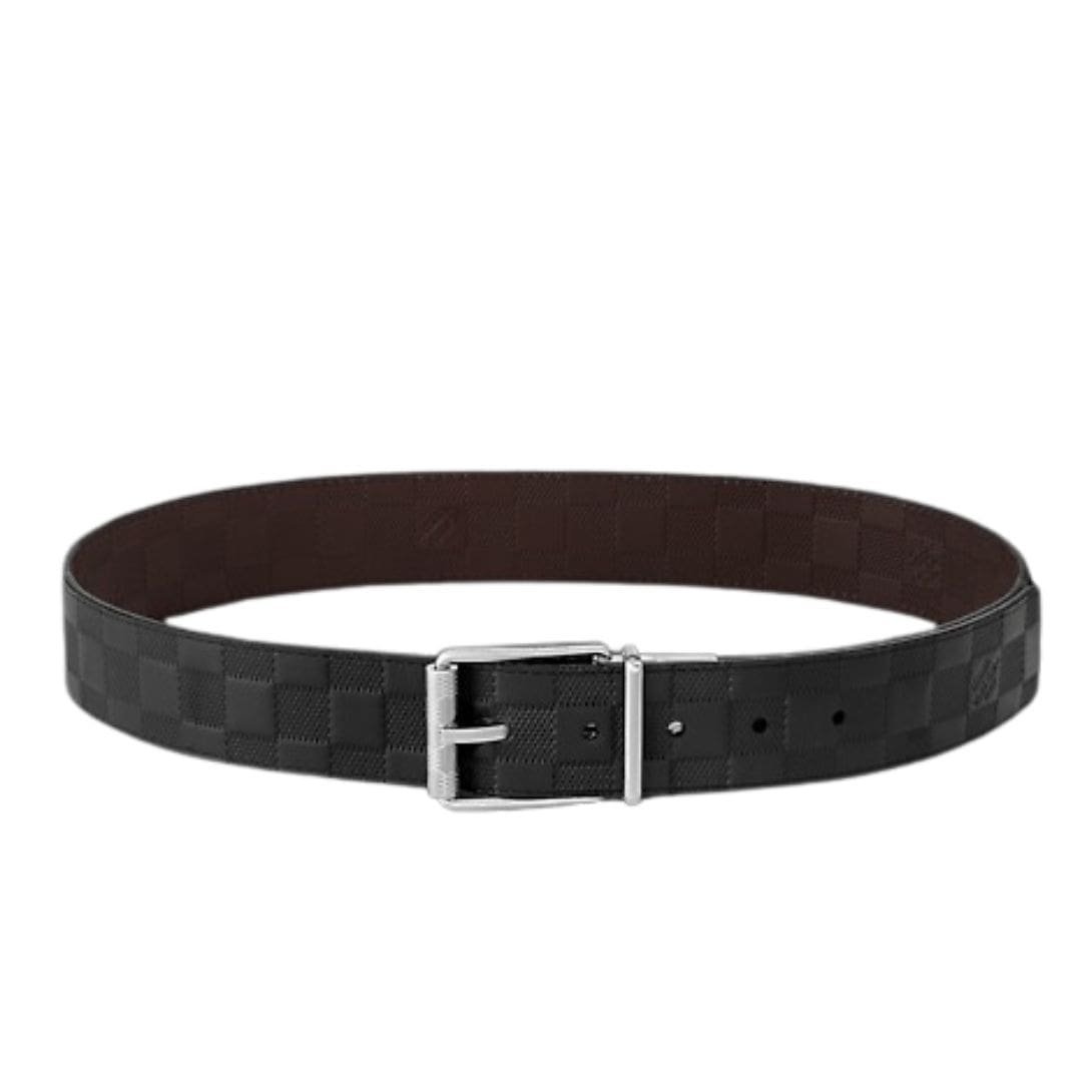 The reversible feature of the belt adds a layer of practicality and versatility, allowing the wearer to effortlessly switch between two distinct looks. One side features the classic Damier print, while the reverse side offers a sleek and sophisticated black calf leather, providing options to suit different styles and occasions.