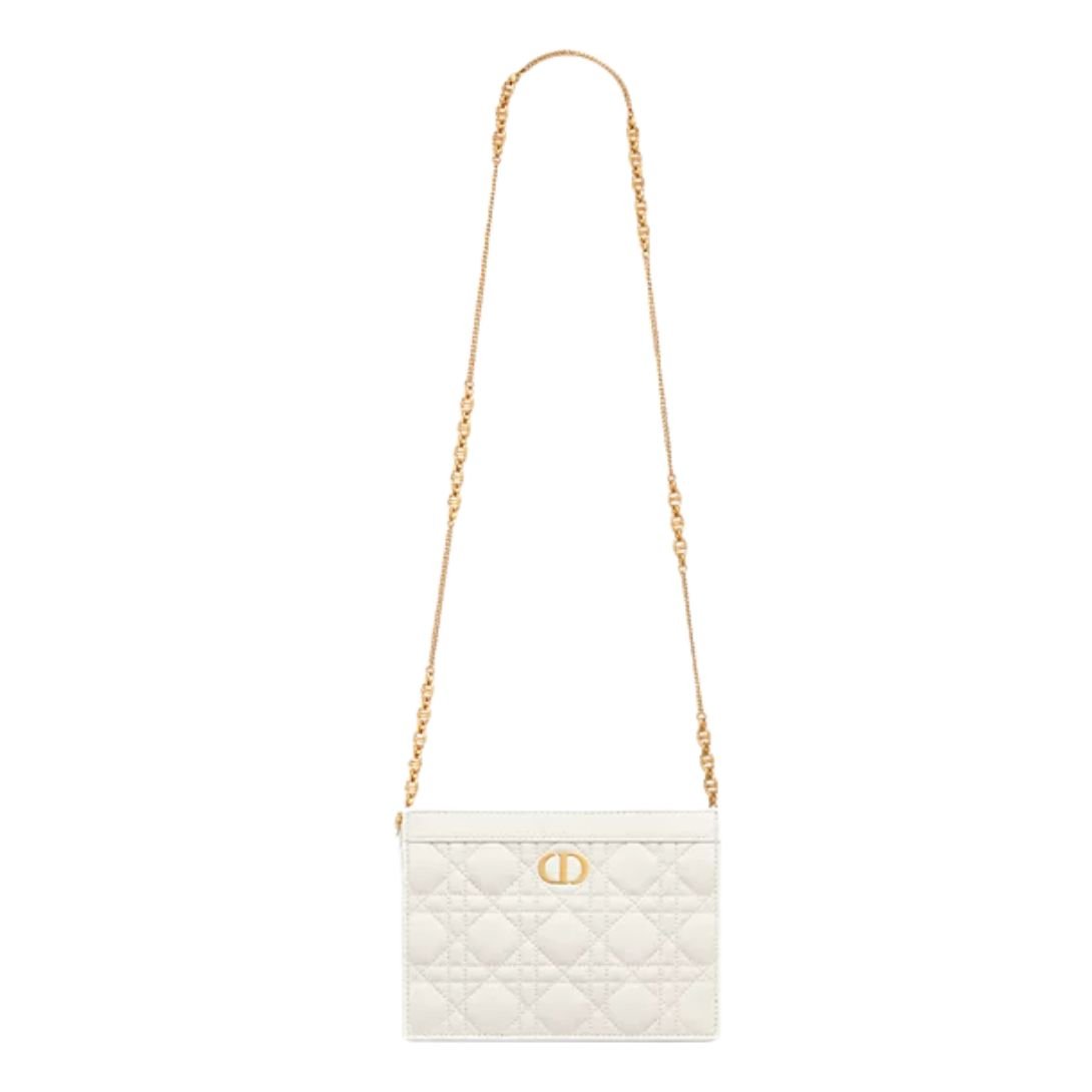 Crafted in soft calfskin, the pouch features a flap closure and a removable chain strap with CD links, allowing for multiple styling options—handheld, over the shoulder, or crossbody. The sophisticated detailing and compact size make it a seamless addition to both casual and formal ensembles.