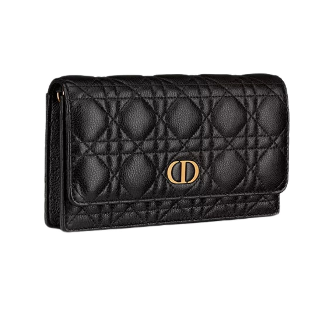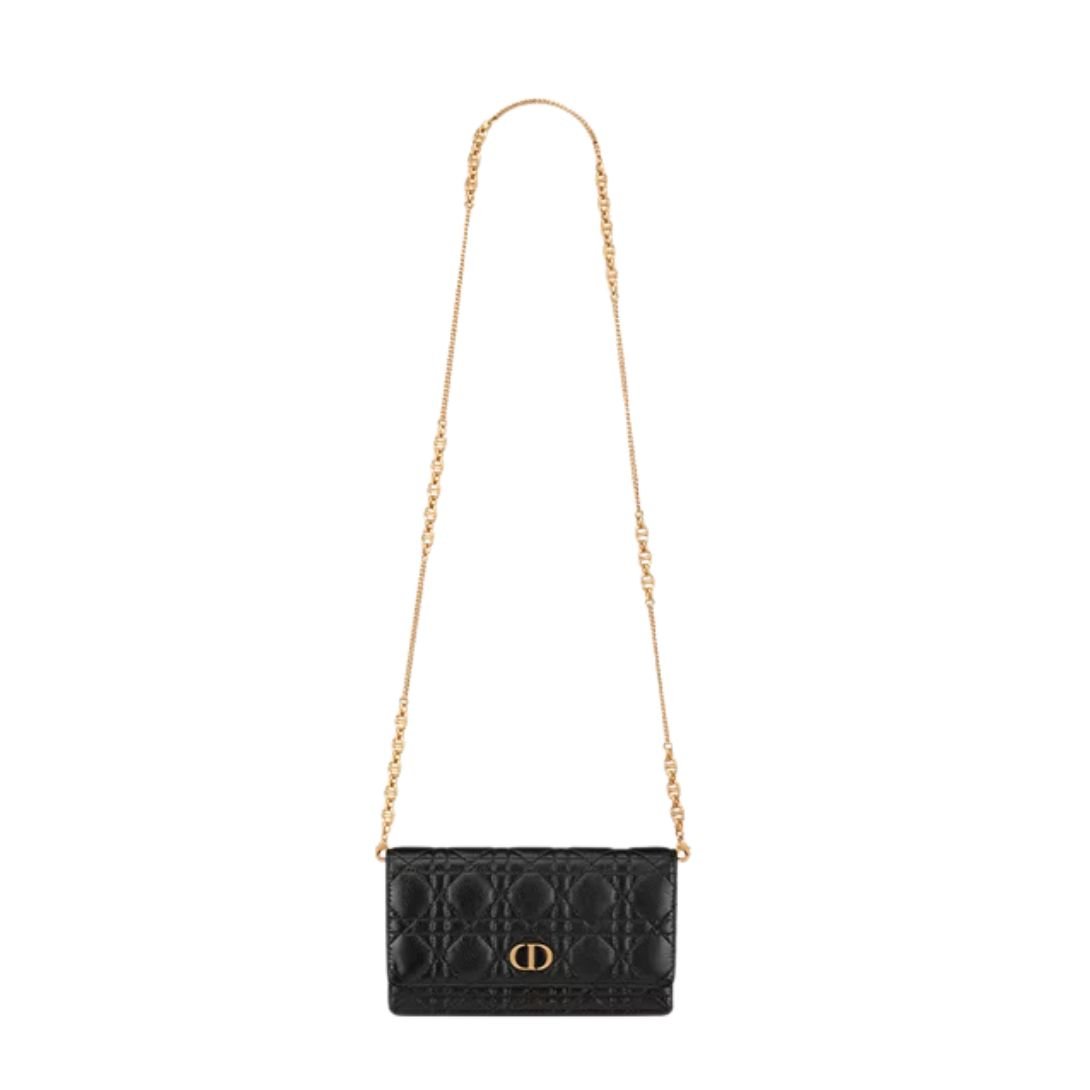 The Dior Caro Pouch with Chain is a practical yet refined accessory that combines elegance with everyday functionality. Crafted in black supple calfskin and detailed with Cannage stitching, it features a flap adorned with an antique gold-finish metal CD signature. Designed to hold all the essentials, it includes an organized interior and a removable CD-link chain, allowing the pouch to be carried by hand, worn over the shoulder, or styled crossbody — making it a versatile daily companion.