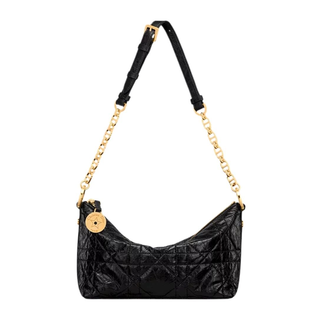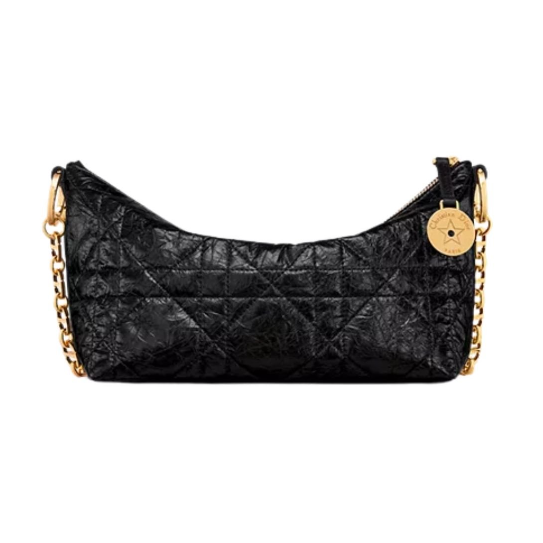 Fusing contemporary flair with timeless House codes, the Diorstar hobo bag brings effortless style to everyday wear. Crafted in supple black Macrocannage crinkled calfskin, its modern silhouette is complemented by discreet CD stud detailing and a spacious interior designed for life on the go.
