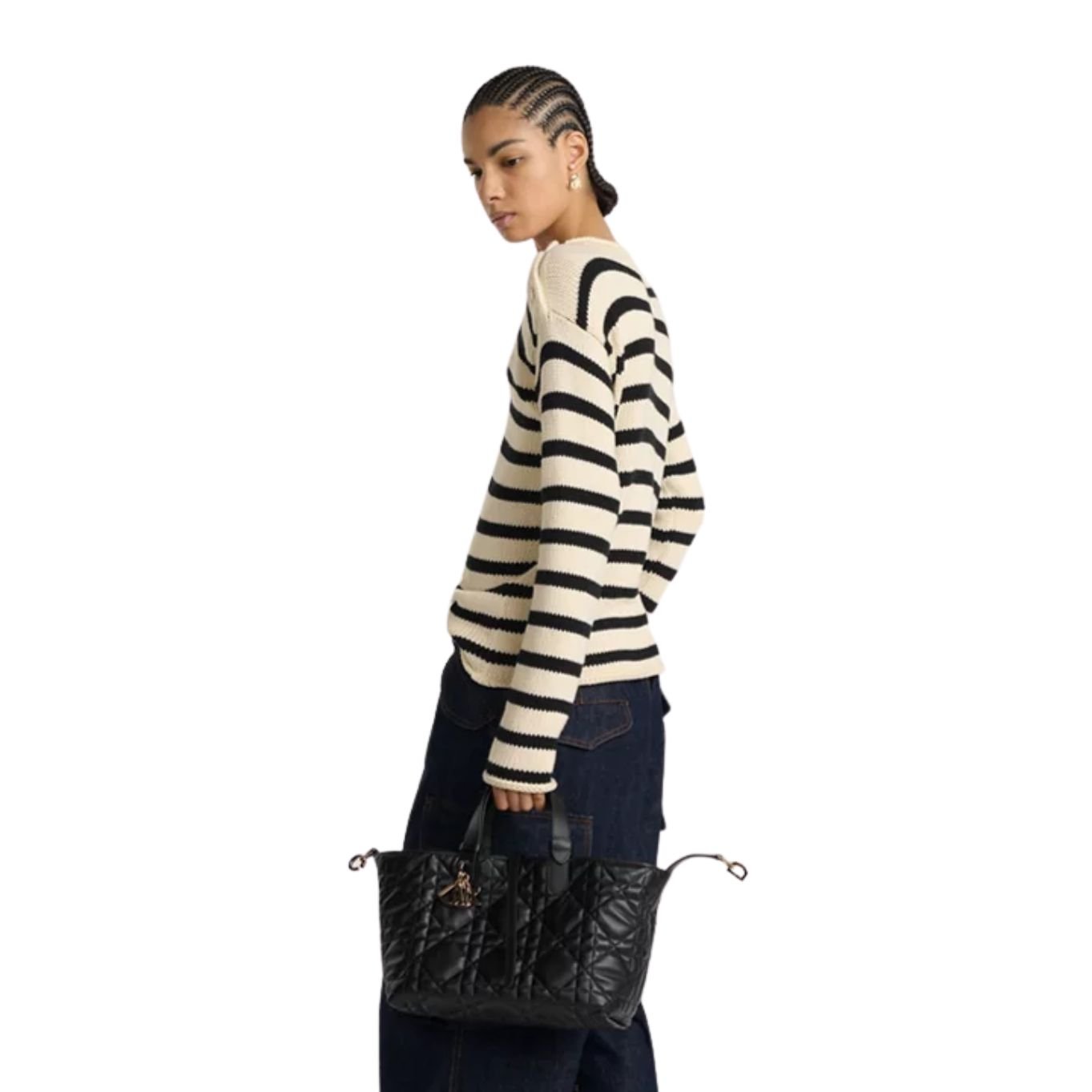 The Dior Toujours Bag blends casual elegance with functional design. Crafted in black calfskin with signature Macrocannage topstitching, it features a spacious main compartment and a matching removable pouch to keep essentials organized. A thin leather strap secures the interior, while the CD Lock claspadorned with a twisting “D”—adjusts the silhouette for added style and structure. Adjustable leather top handles with notch detailing allow the medium-sized bag to be carried by hand or worn over the shoulder, offering versatile wear.