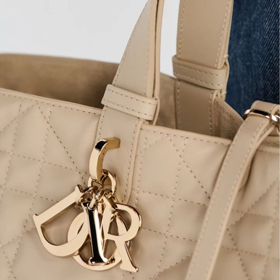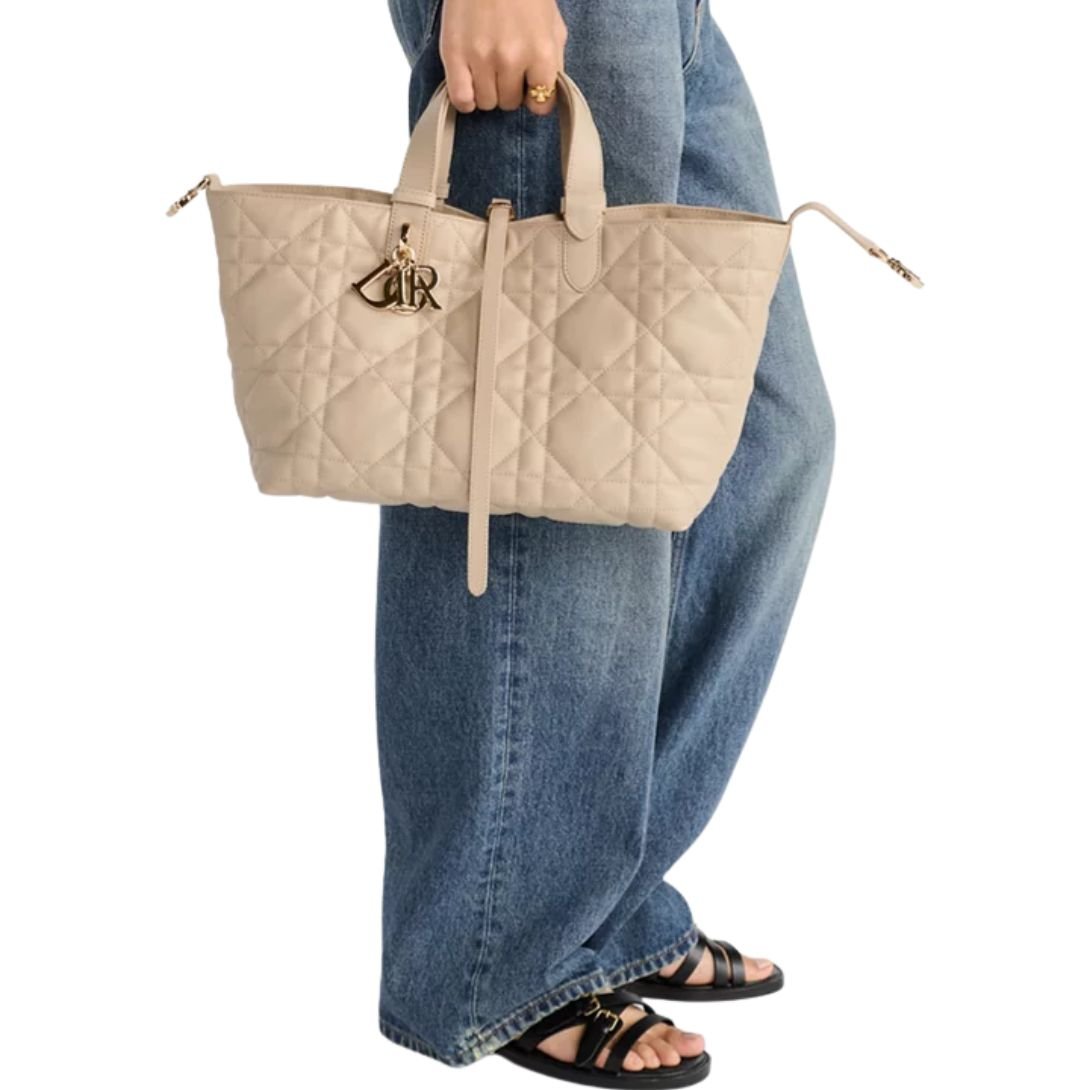 The Dior Toujours Bag blends casual elegance with functional design. Crafted in black calfskin with signature Macrocannage topstitching, it features a spacious main compartment and a matching removable pouch to keep essentials organized. A thin leather strap secures the interior, while the CD Lock clasp—adorned with a twisting “D”—adjusts the silhouette for added style and structure. Adjustable leather top handles with notch detailing allow the medium-sized bag to be carried by hand or worn over the shoulder, offering versatile wear.
