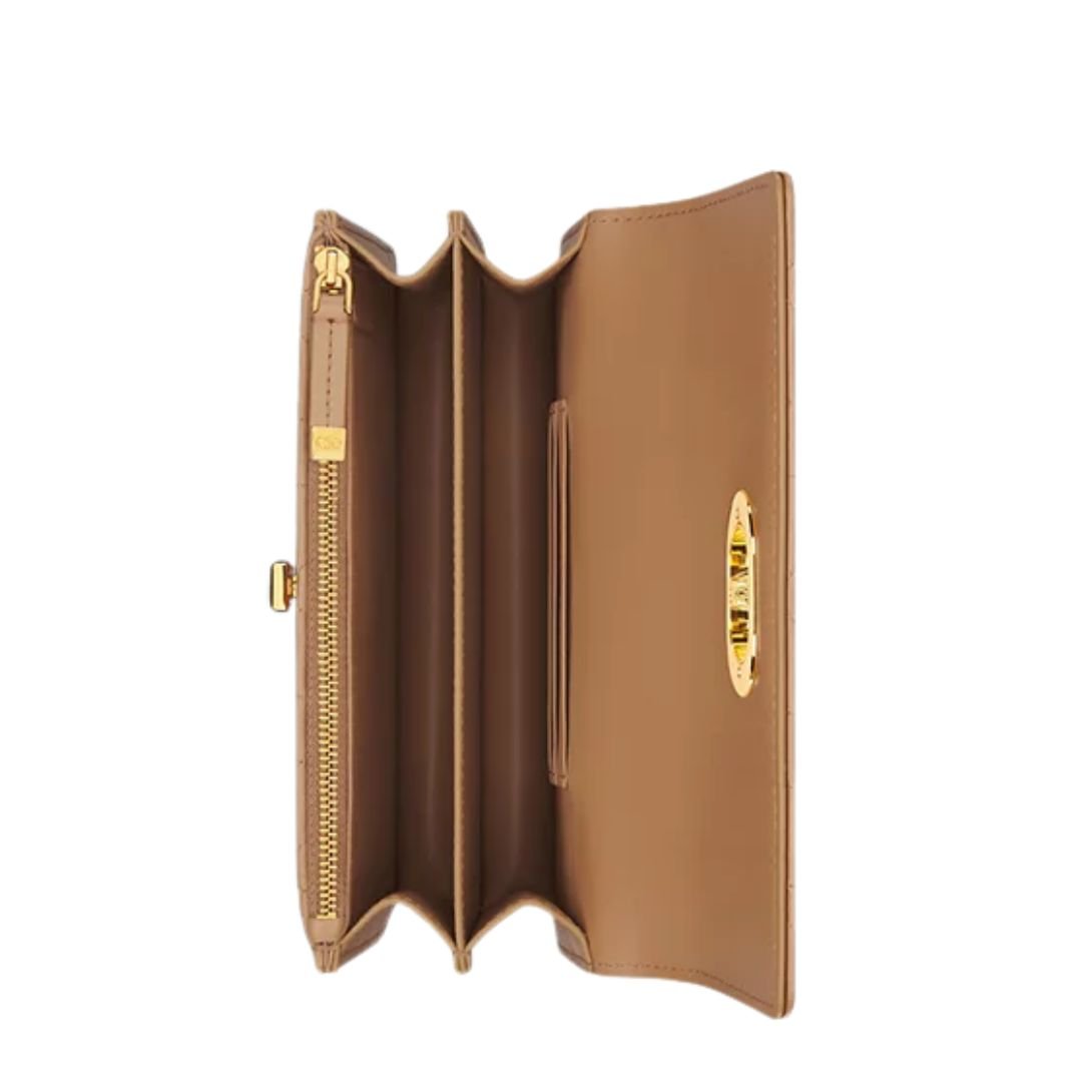 The Miss Caro Mini Bag refines the Dior Caro line with a blend of modern sophistication and timeless charm. Crafted in black lambskin, it features Macrocannage stitching for a distinct quilted texture. The flap is accented by a gold-finish metal CD twist clasp, inspired by the seal of a Christian Dior perfume bottle. The adjustable chain strap alternates between gold-finish metal links and tonal enamel links, with a leather insert for added carrying comfort — by hand, over the shoulder, or crossbody.
