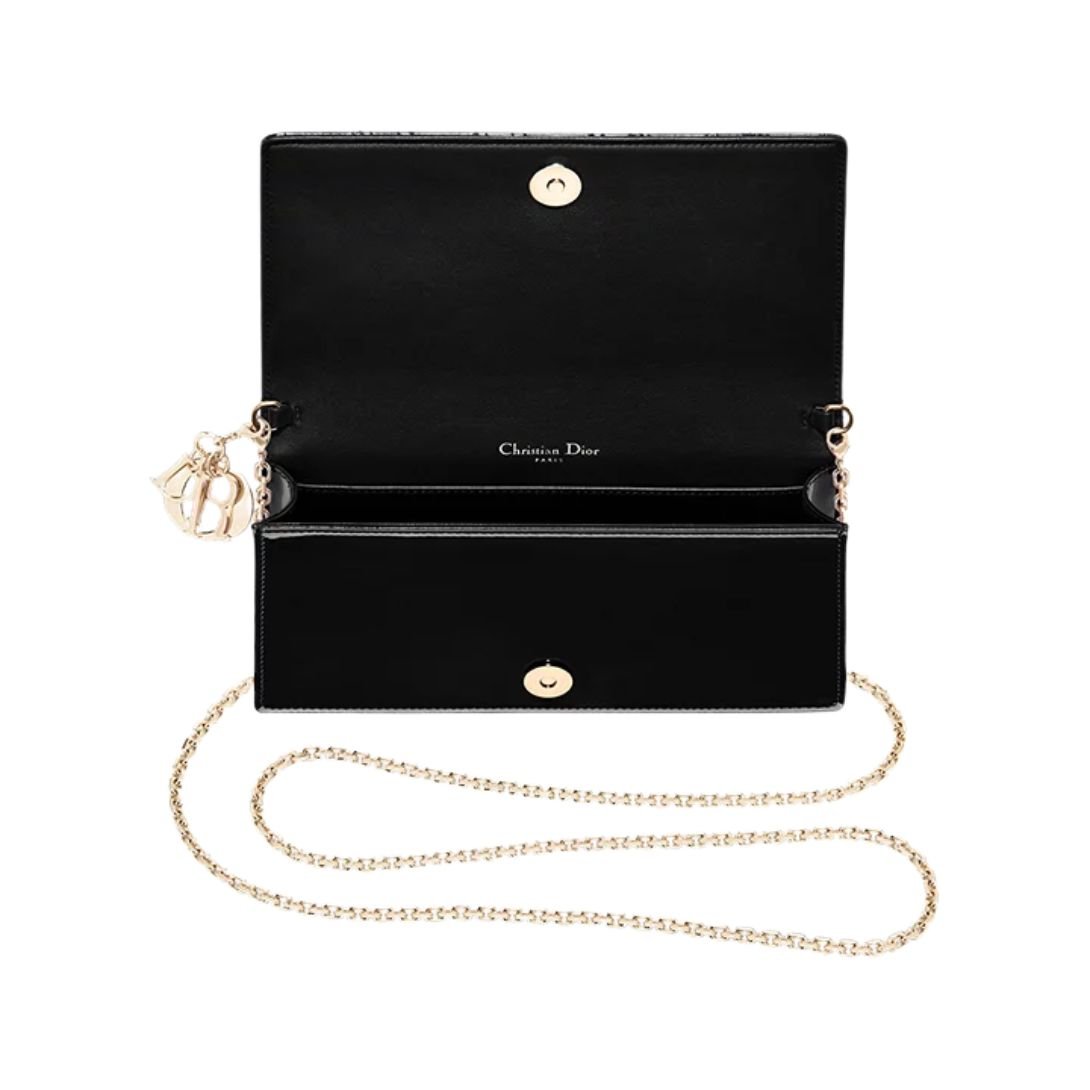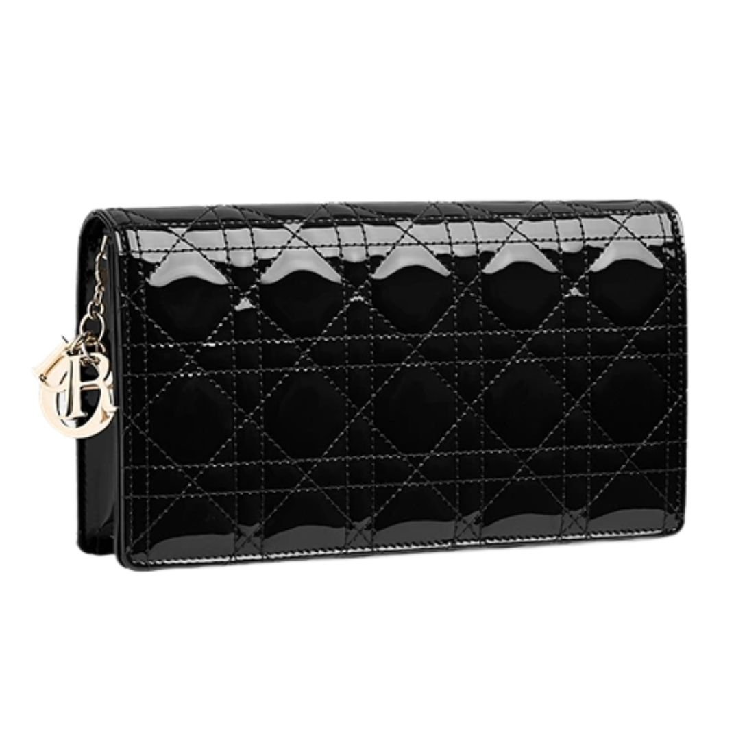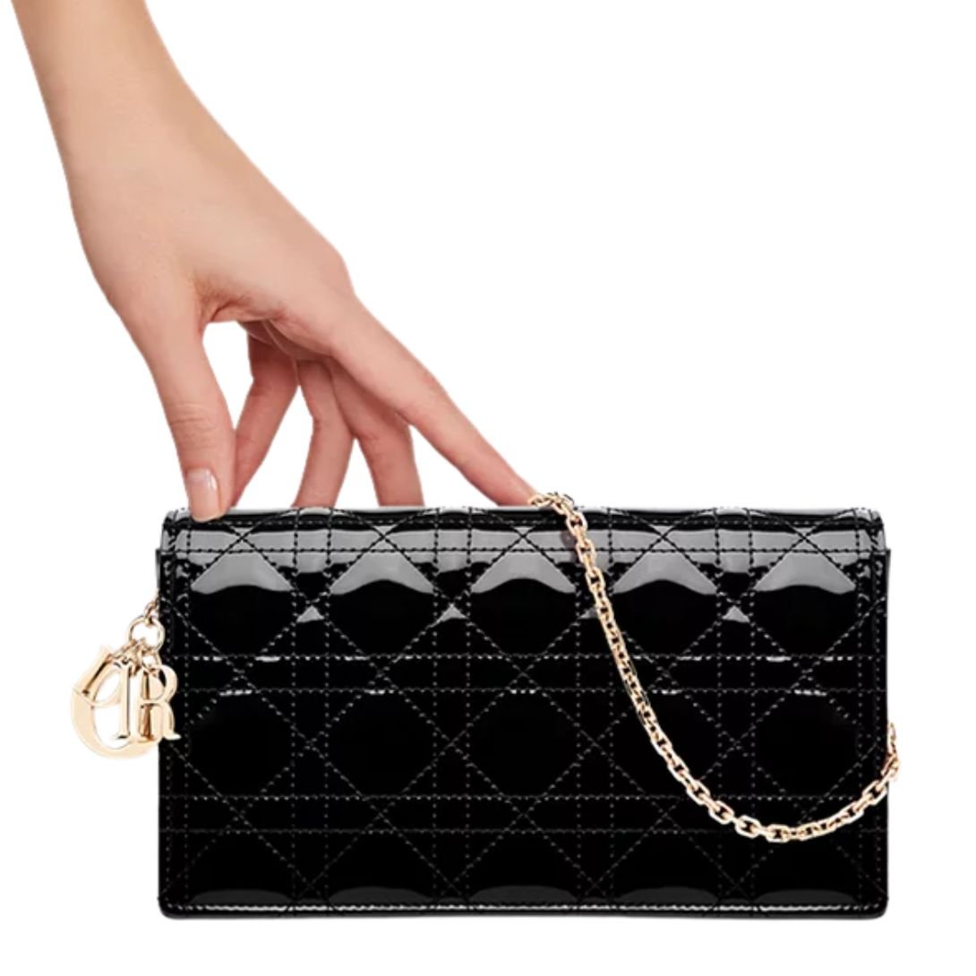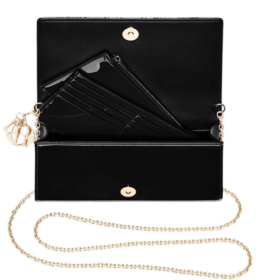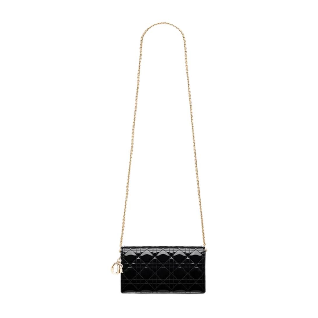 The Lady Dior Pouch is a versatile and refined accessory, crafted in black patent calfskin and distinguished by the iconic Cannage topstitching. Accented with detachable D.I.O.R. charms, it can be worn with or without its removable chain strap. The design includes two detachable components — a zipped pouch and a card holder with eight slots and a slip pocketboth of which can be carried individually. Stylish and functional, the pouch makes an elegant statement and pairs beautifully with other pieces from the Lady Dior line.