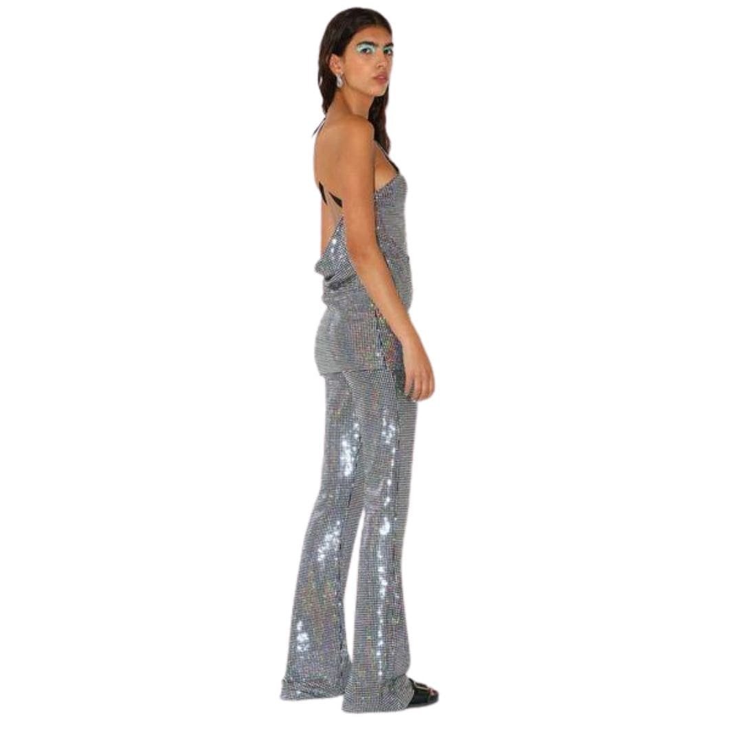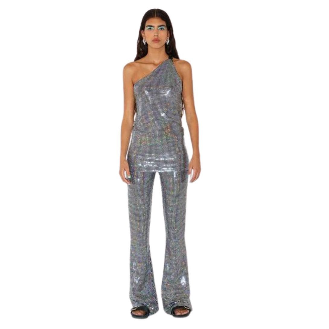 The Dodo Bar OR Gabrielle Pants Crafted from satin jersey embellished with square mirrors, the Gabrielle Pants are designed for a tight fit with flared legs.