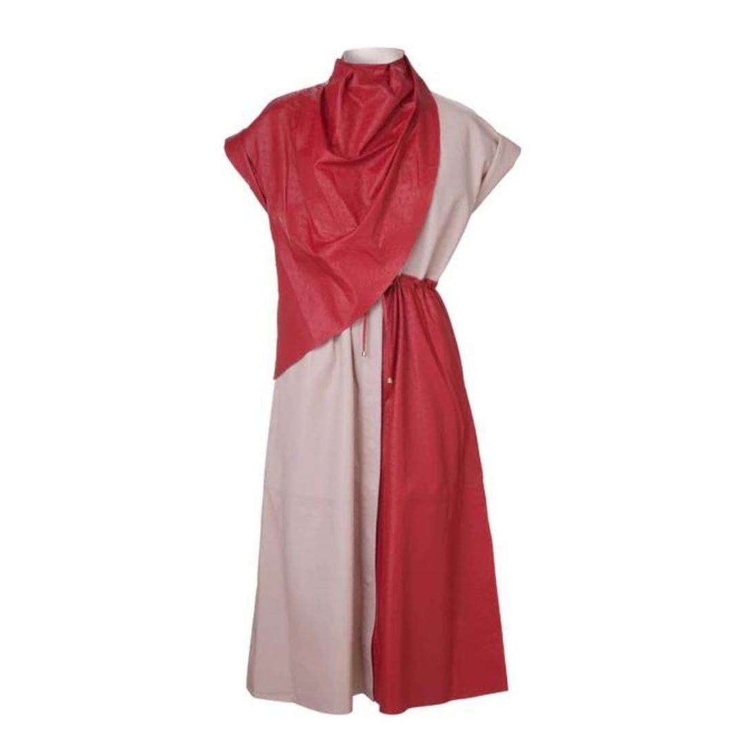 The Dodo Bar OR Paula dress is crafted from a two-tone ostrich-printed leather and features an oversized shawl collar with an adjustable drawstring waist.