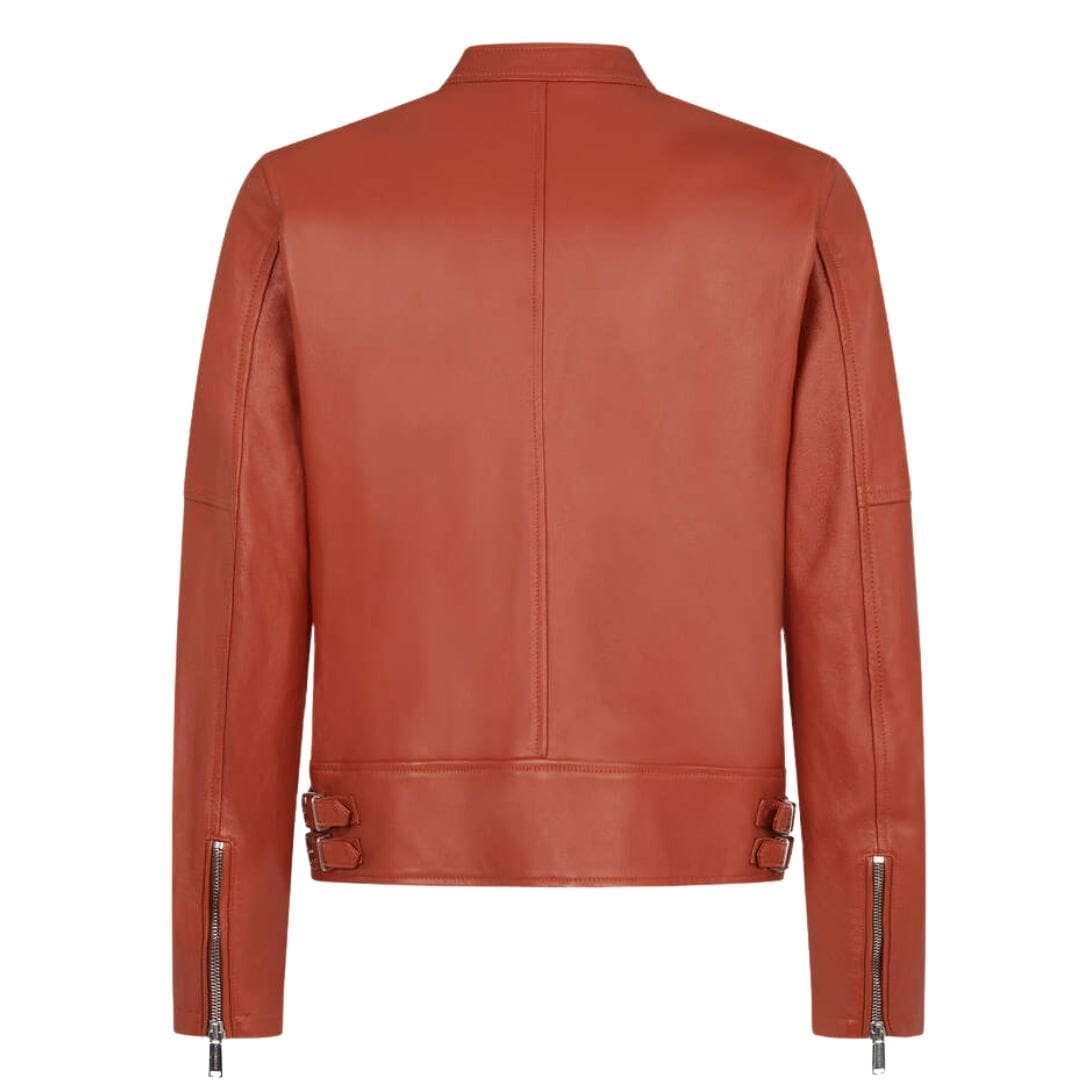 At first glance, the jacket’s sleek, black leather exterior exudes a sense of rugged elegance. The high-quality leather is not only durable but also gains character with wear, enhancing its appeal over time. The finish is slightly glossy, adding a modern touch to the classic biker look. The jacket features a fitted silhouette, tailored to accentuate the wearer’s frame while allowing enough room for comfortable movement.